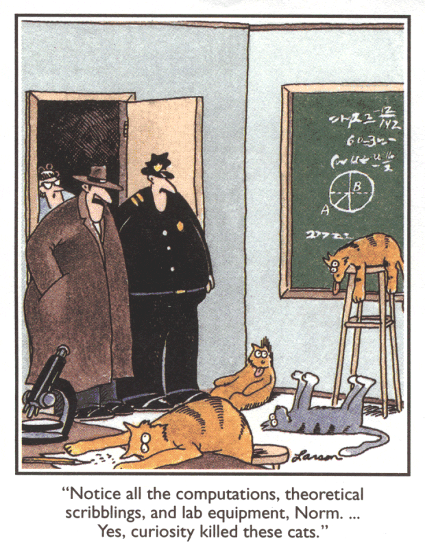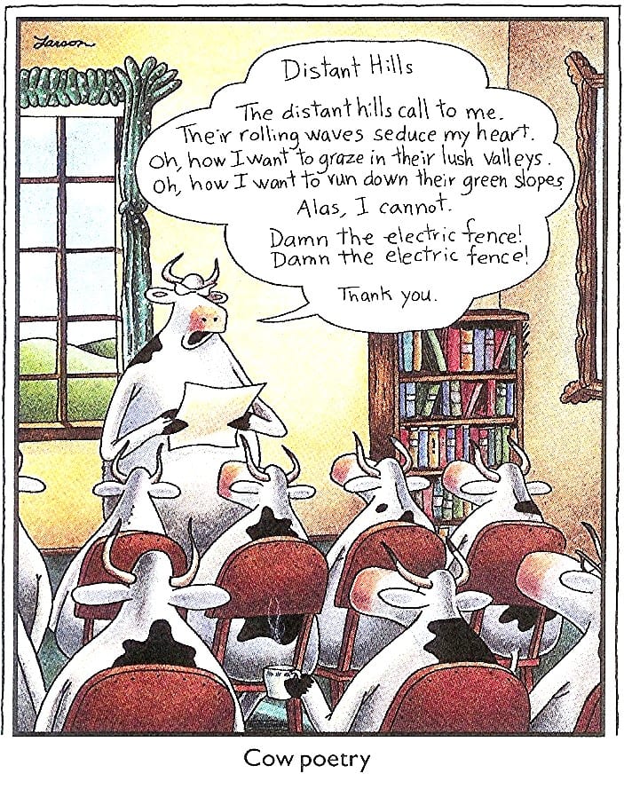 Its surrealistic humor is often based on uncomfortable social situations, improbable events, an anthropomorphic view of the world, logical fallacies, impending bizarre disasters, (often twisted) references to proverbs or the search for meaning in life. Larson’s frequent use of animals and nature in the comic is popularly attributed to his background in biology. Reruns are still printed in many newspapers.