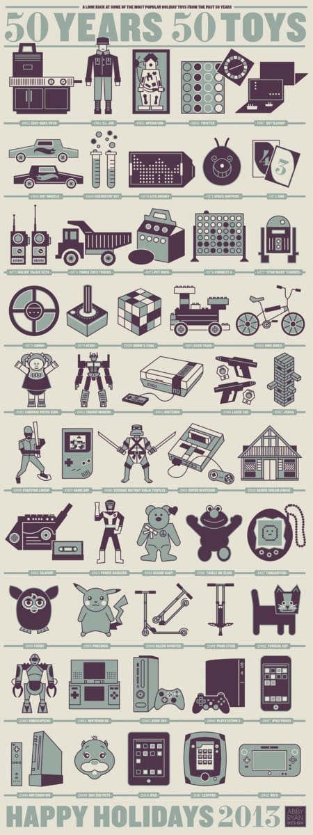 This visual chart highlighting the most popular toys from 1963’s to 2013 is a neat way to see the evolution of technology. From the Walkie Talkies to the Easy Bake Ovens to the Ipad generation!