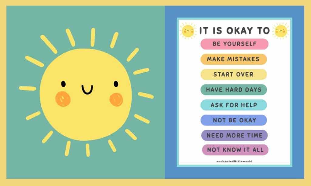 With its sunny design and affirmations like “Itโs okay to have hard days” and “Itโs okay to not know it all,” this printable is ideal for classrooms, homeschooling spaces, or even kidsโ bedrooms.