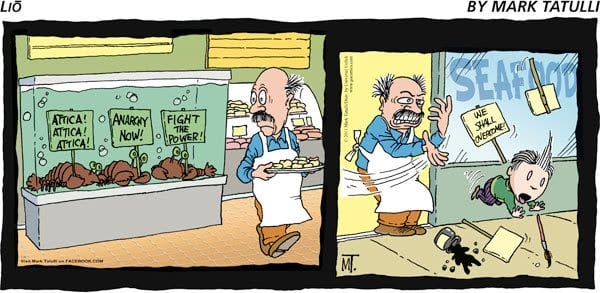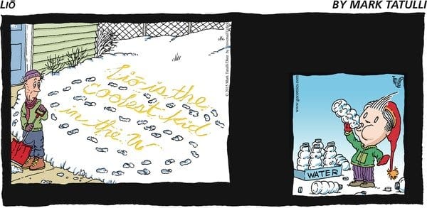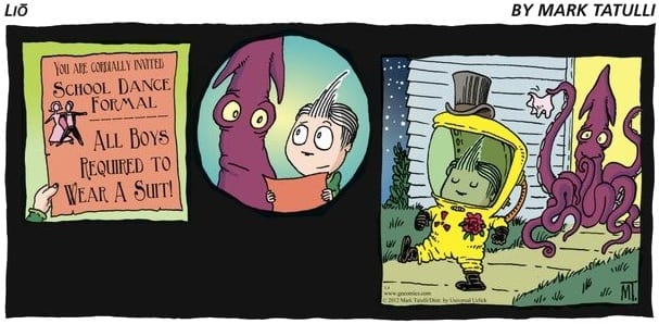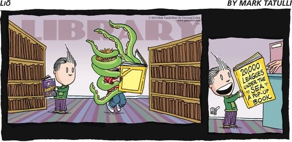 The title character is a “weird little boy” who inhabits a world occupied by aliens, monsters, robots, and other strange characters. According to Tatulli, he came up with the name “Lio” because he “wanted a simple name to go with the simple, wordless concept. Just three letters.” In 2012, Tatulli released Lio: There’s a Monster in My Socks, a book compiling comic strips from the first year that the cartoon was distributed, with a focus on those strips that would most appeal to children. In 2009 Tatulli was recognized as “Best Comic Strip” by the National Cartoonists Society