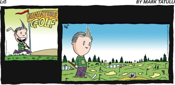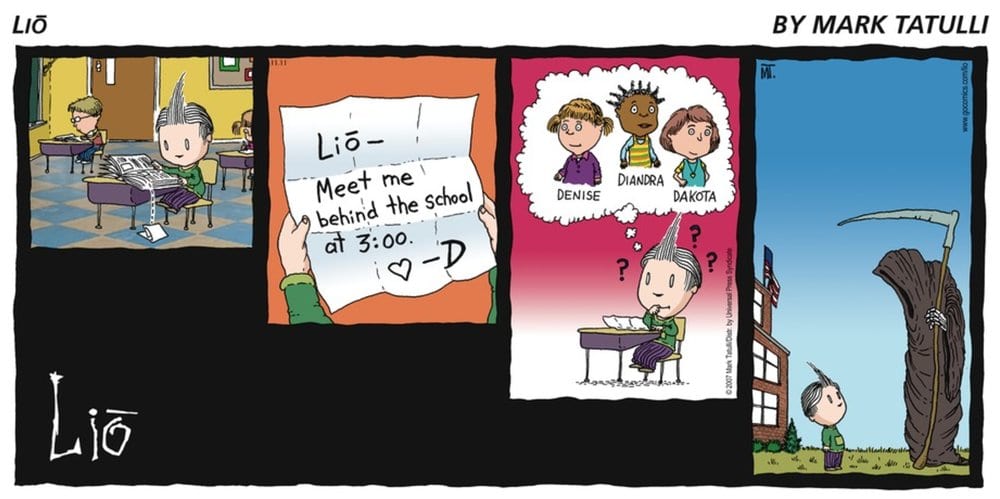After trying unsuccessfully to promote eight different strips over a decade, his first comic strip was Bent Halos, which features two angels named Harold and Mort who achieve little success in their attempted roles as guardian angels. Liō, which has been published since May 2006, is a “sweetly dark” pantomime cartoon without dialogue that was inspired by Tatulli’s love of the horror movies he watched while growing up as a child in the 1970s.