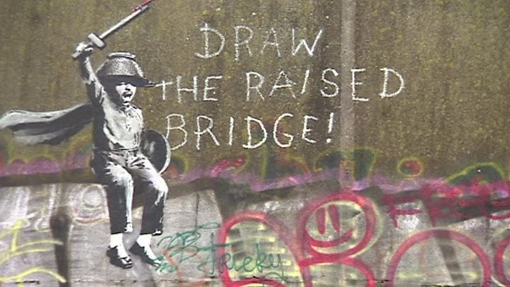 “Banksy is an anonymous England-based street artist, vandal, political activist, and film director. His satirical street art and subversive epigrams combine dark humor with graffiti executed in a distinctive stencilling technique”. Wikipedia
