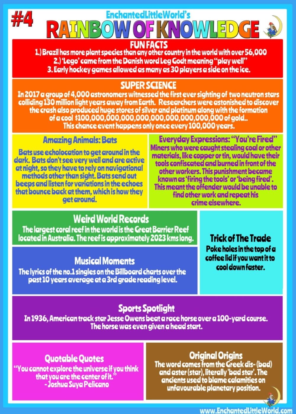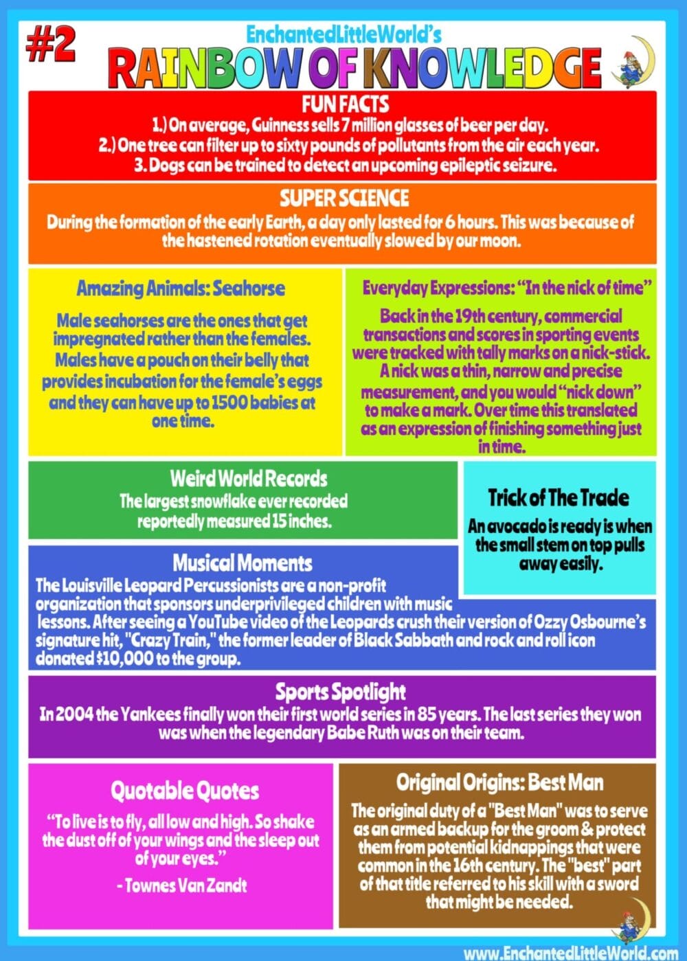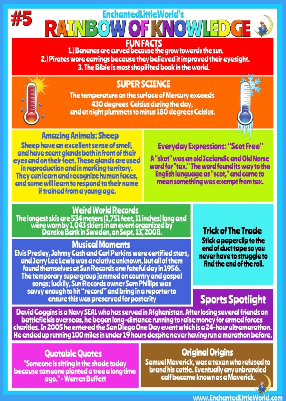 Rainbow of Knowledge: A Cool Infographic Featuring: Fun Facts, Super Science, Amazing Animals, Weird World Records, and Everyday Expressions! Learn some Tricks of The Trade, discover Musical Moments & find some Quotable Quotes.