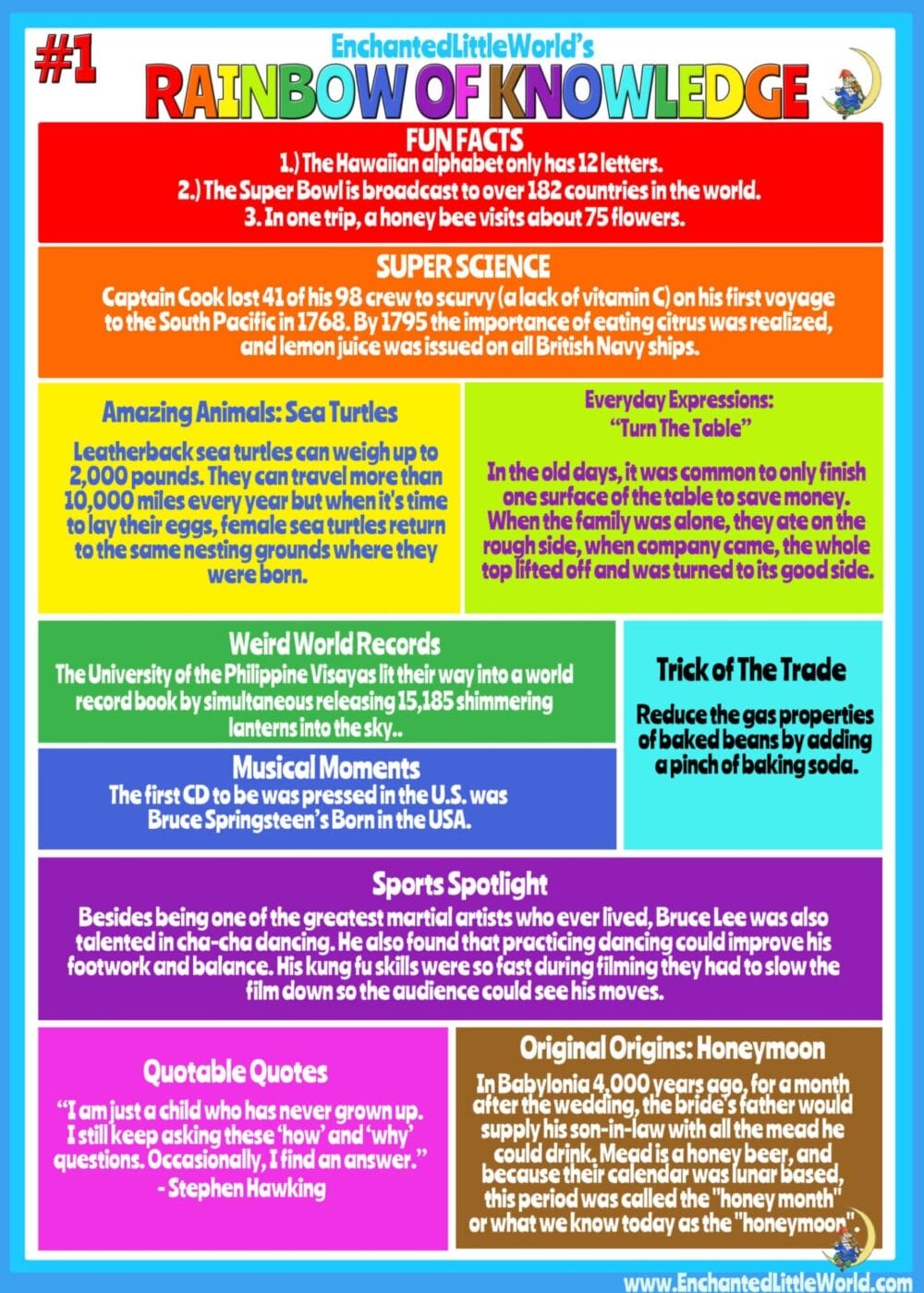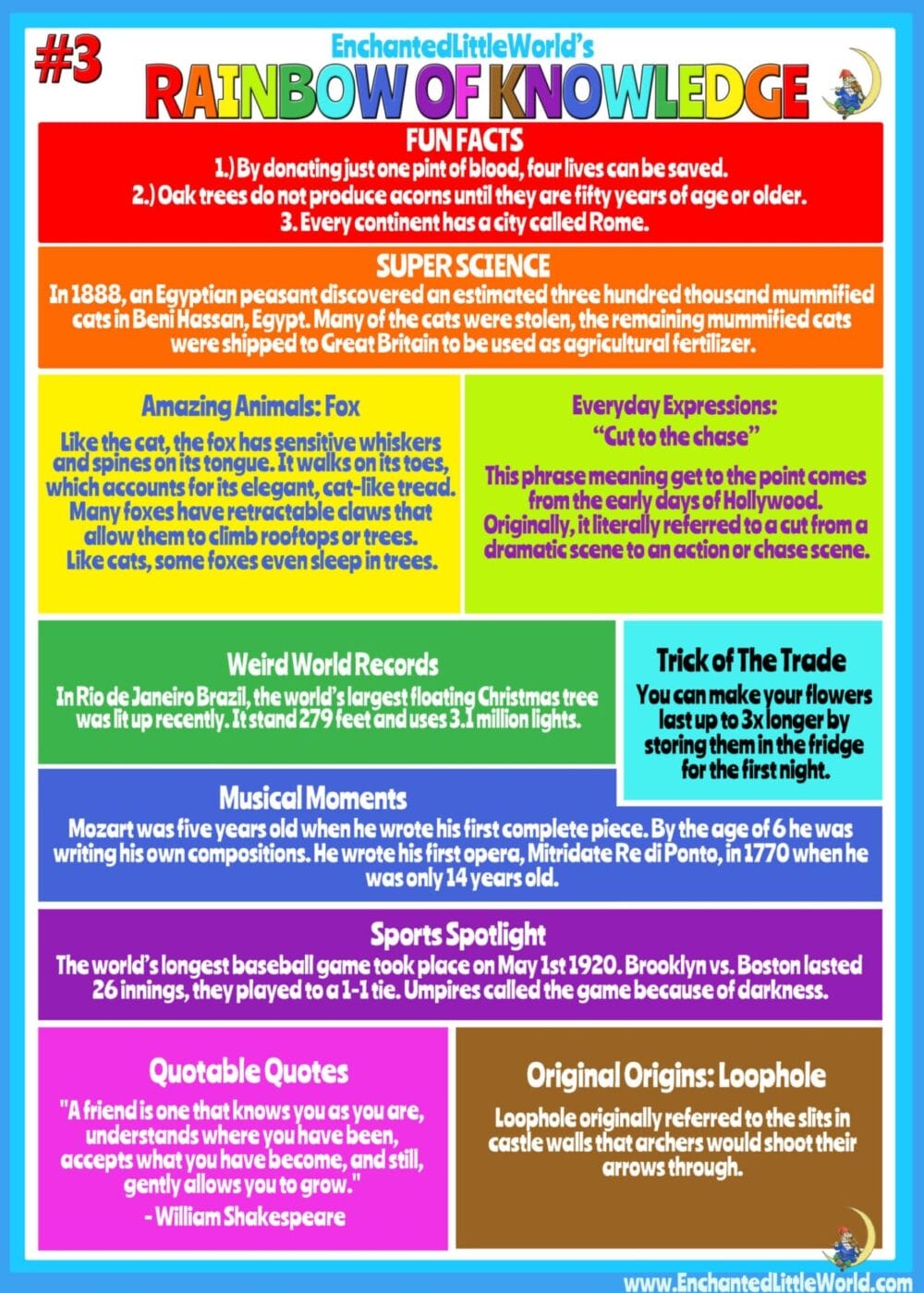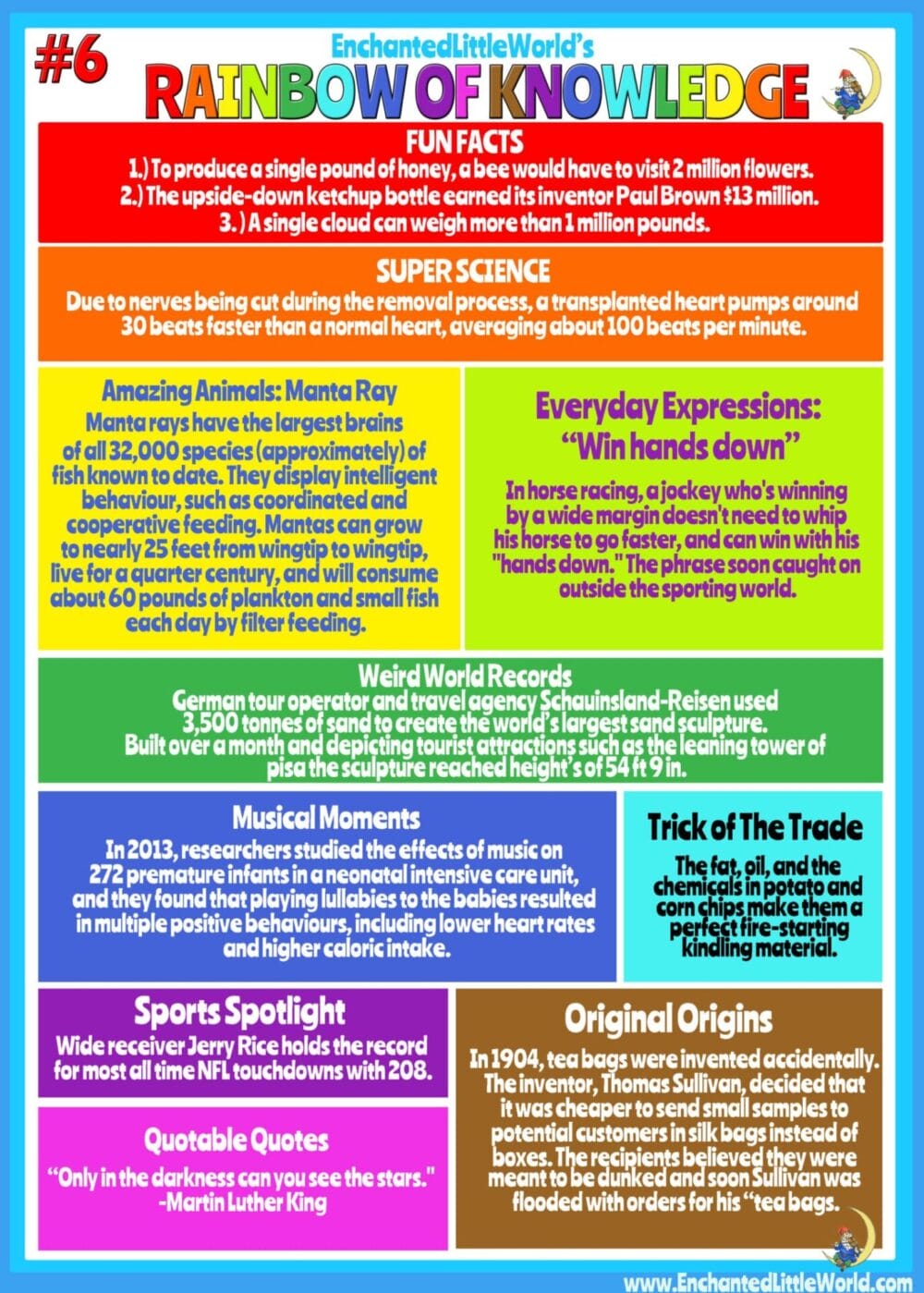 Rainbow of Knowledge: A Cool Infographic Featuring: Fun Facts, Super Science, Amazing Animals, Weird World Records, and Everyday Expressions! Learn some Tricks of The Trade, discover Musical Moments & find some Quotable Quotes.