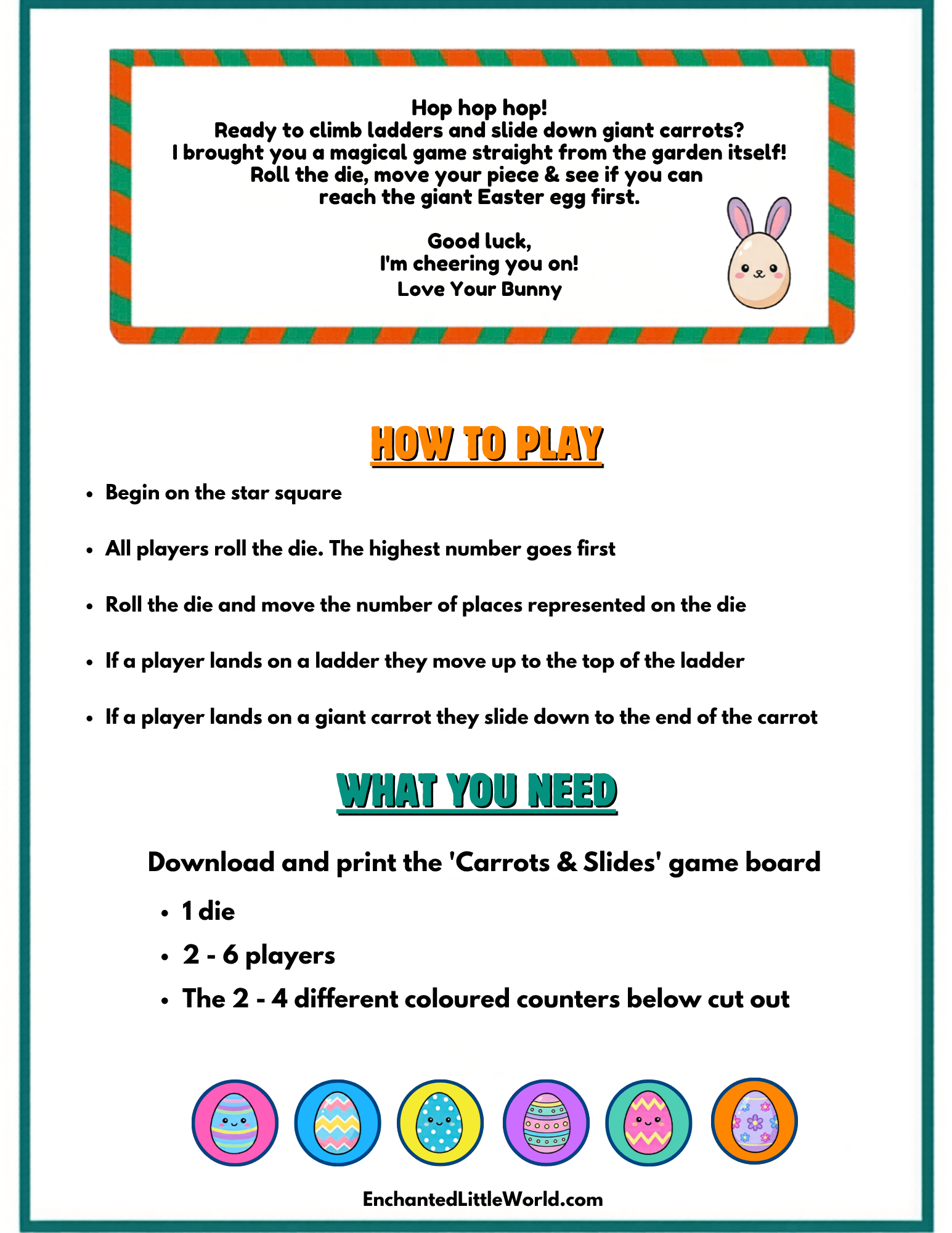 Bring a touch of magic and friendly competition to your morning with this free printable Easter board game for kids, featuring the whimsical “Carrots & Slides” adventure.