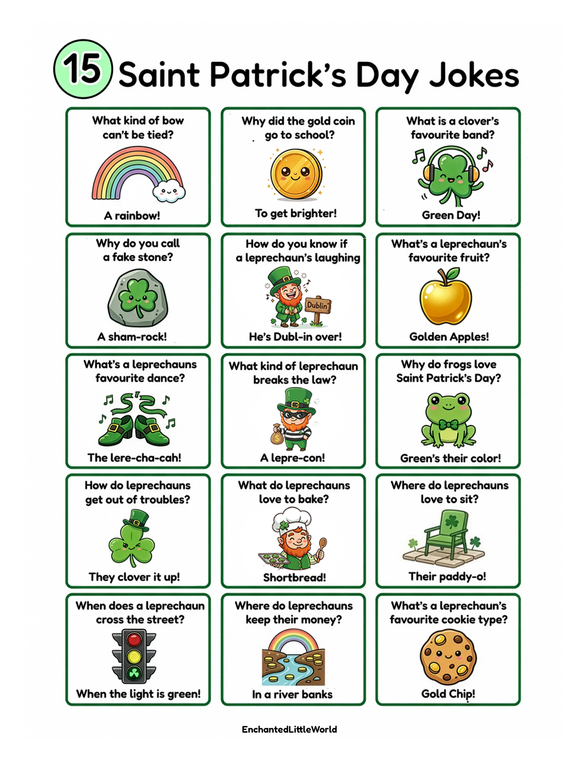 📝 Share a Laugh — Read the jokes together and see who can come up with the funniest leprechaun voice!