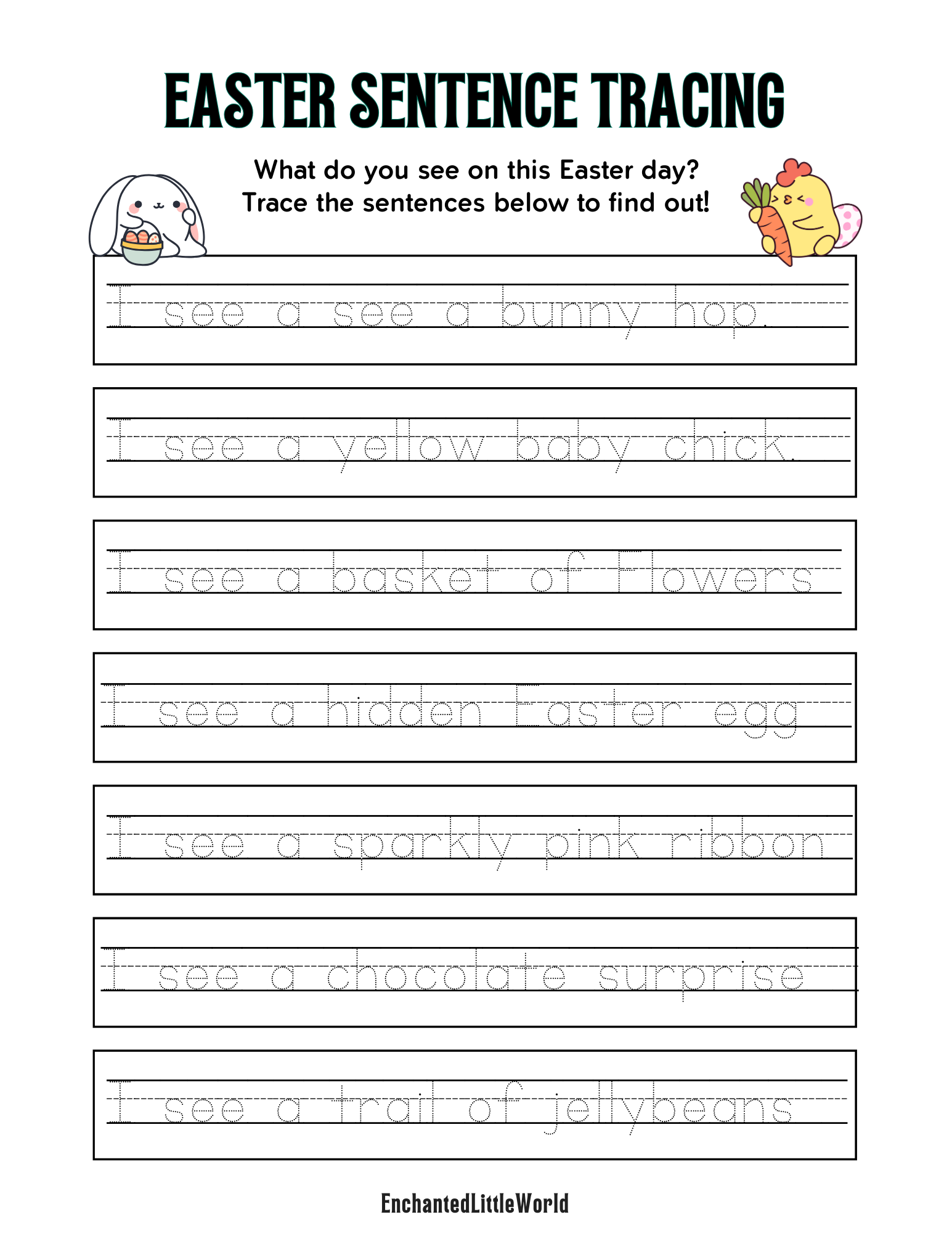 This Easter sentence tracing worksheet features short, kid-friendly sentences like “I see a chocolate egg” and “I see a yellow chick,” designed to build confidence while celebrating all things Easter.