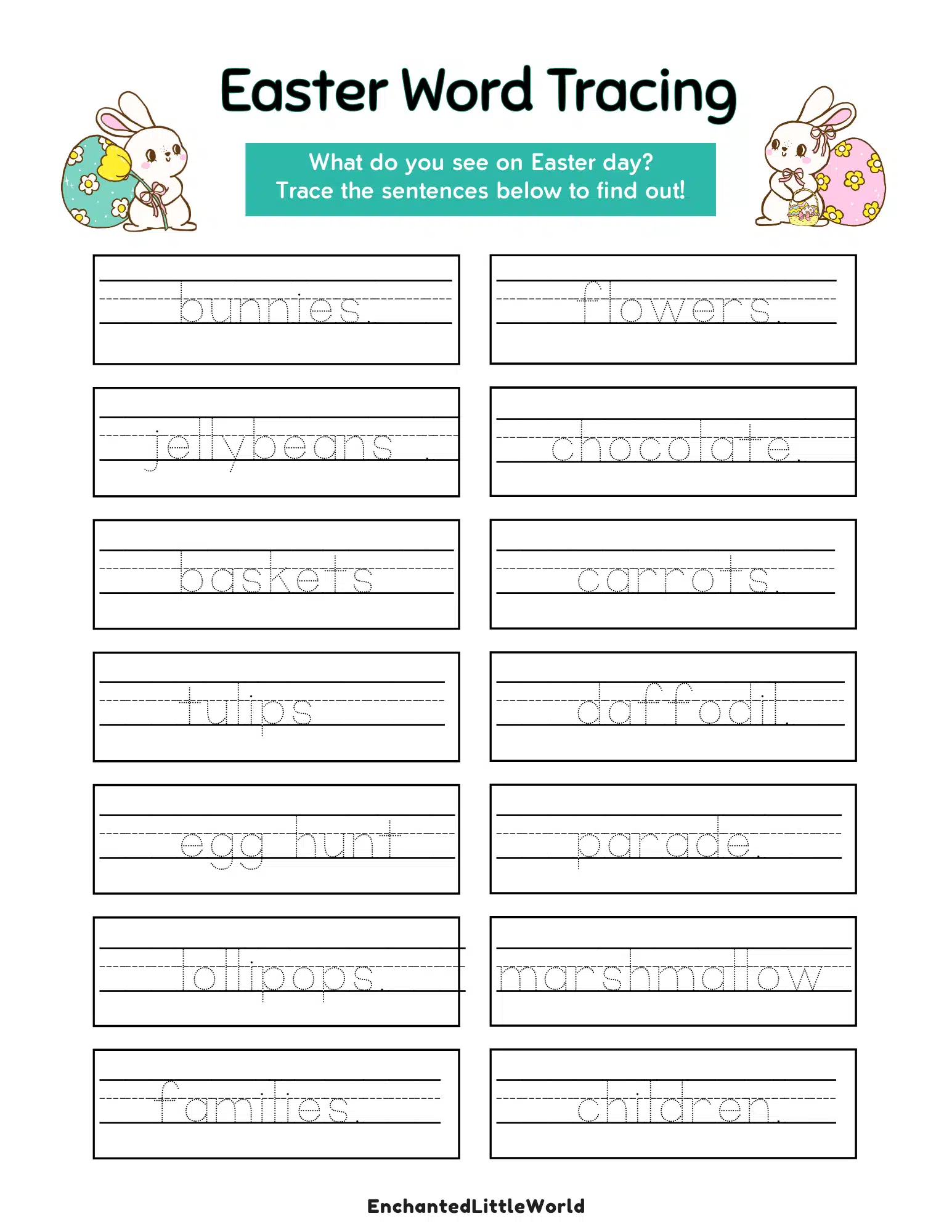 Children will love tracing simple Easter sentences while boosting their handwriting, letter formation, and early reading confidence.