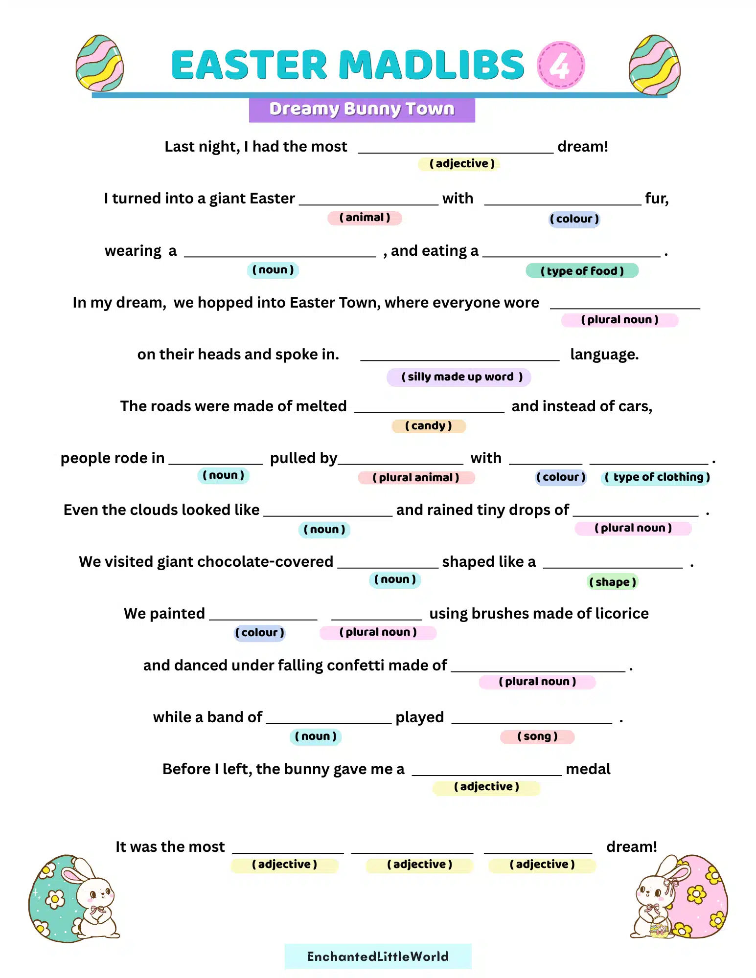 From turning into a giant Easter animal to riding in veggie-pulled wagons and painting with licorice brushes, this free Easter Mad Lib is pure bunny-town magic.