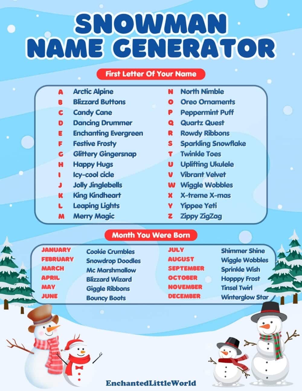 Create snowy fun with our Free Printable Snowman Name Generator—a magical and festive activity for kids of all ages!