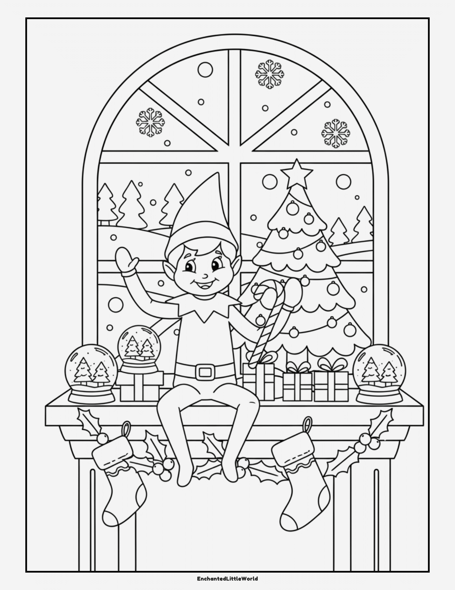 Kids will enjoy coloring the softly falling snow, wrapped presents, holly, snow globes, and the happy elf watching the winter magic unfold through the window.