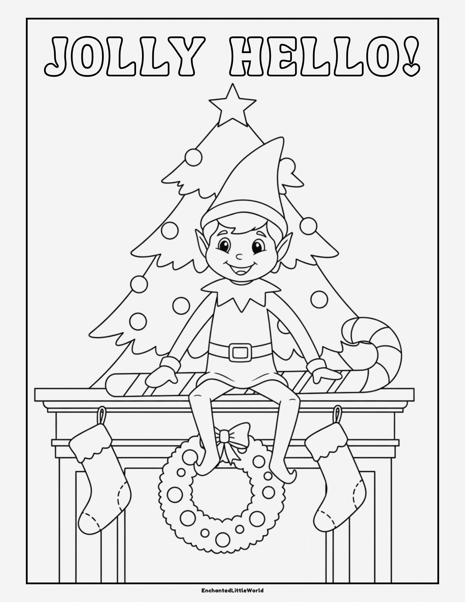 With its bold “Jolly Hello!” greeting, decorated mantel, stockings, wreath, and festive tree, this page gives kids a lively scene to color and enjoy throughout December.