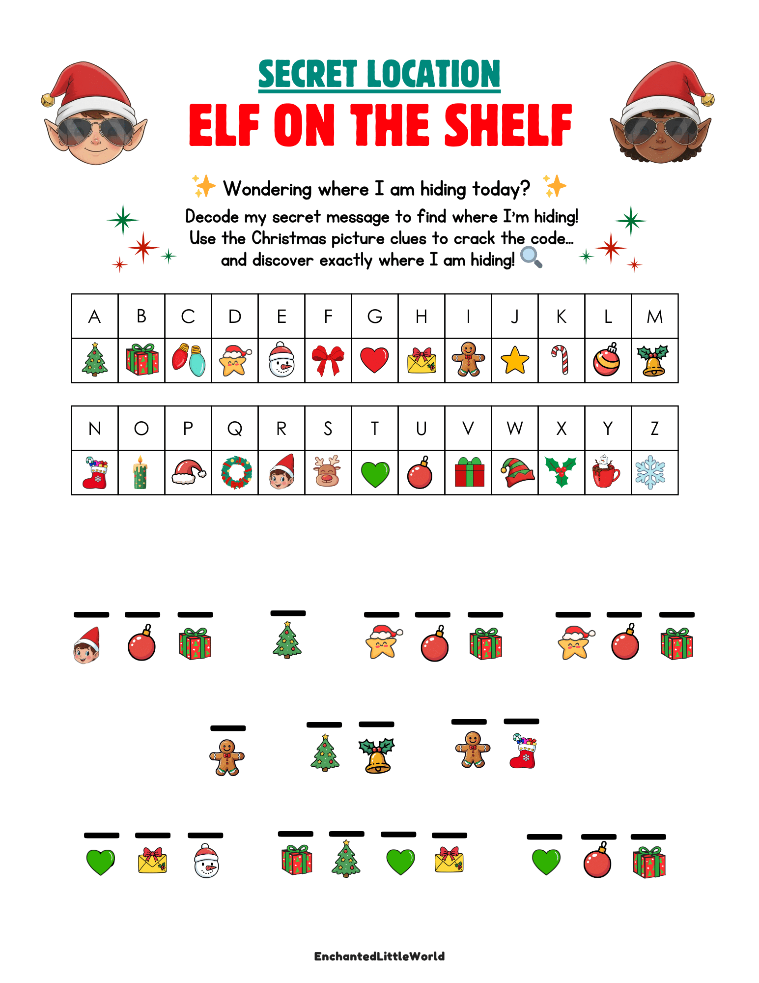 Using adorable Christmas picture clues, kids decode the puzzle to reveal exactly where their Elf on the Shelf is hiding.