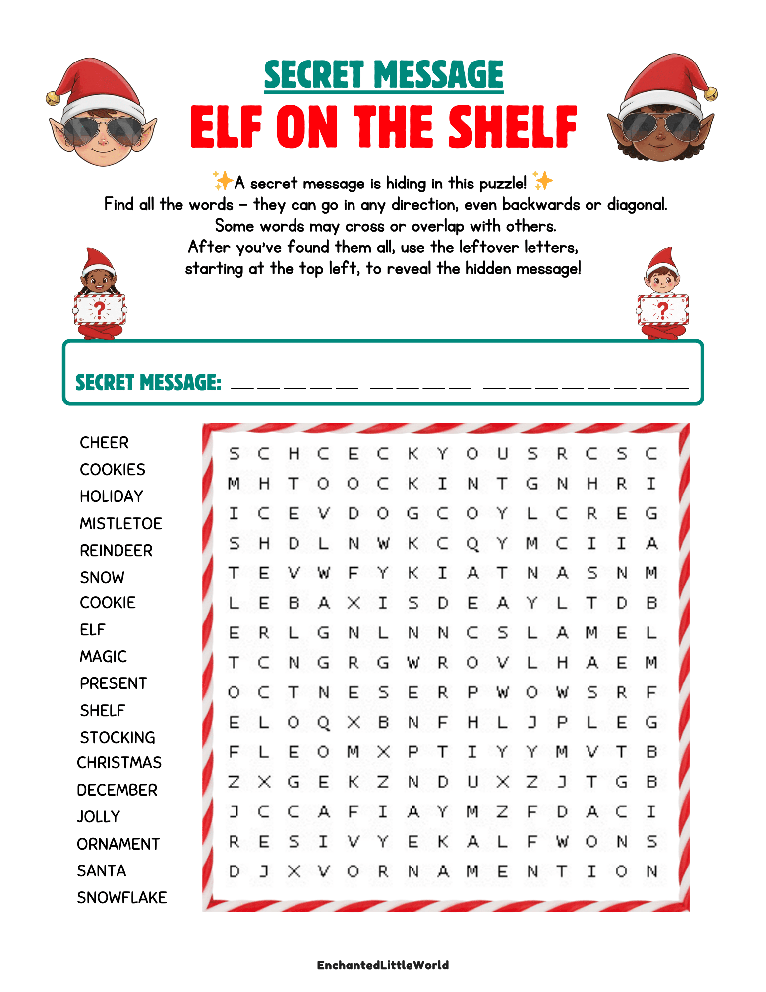 After the complete Elf on the Shelf Word Search they’ll reveal a secret message from their elf that tells them to “Check Their Stocking,” adding surprise and excitement to your December mornings.