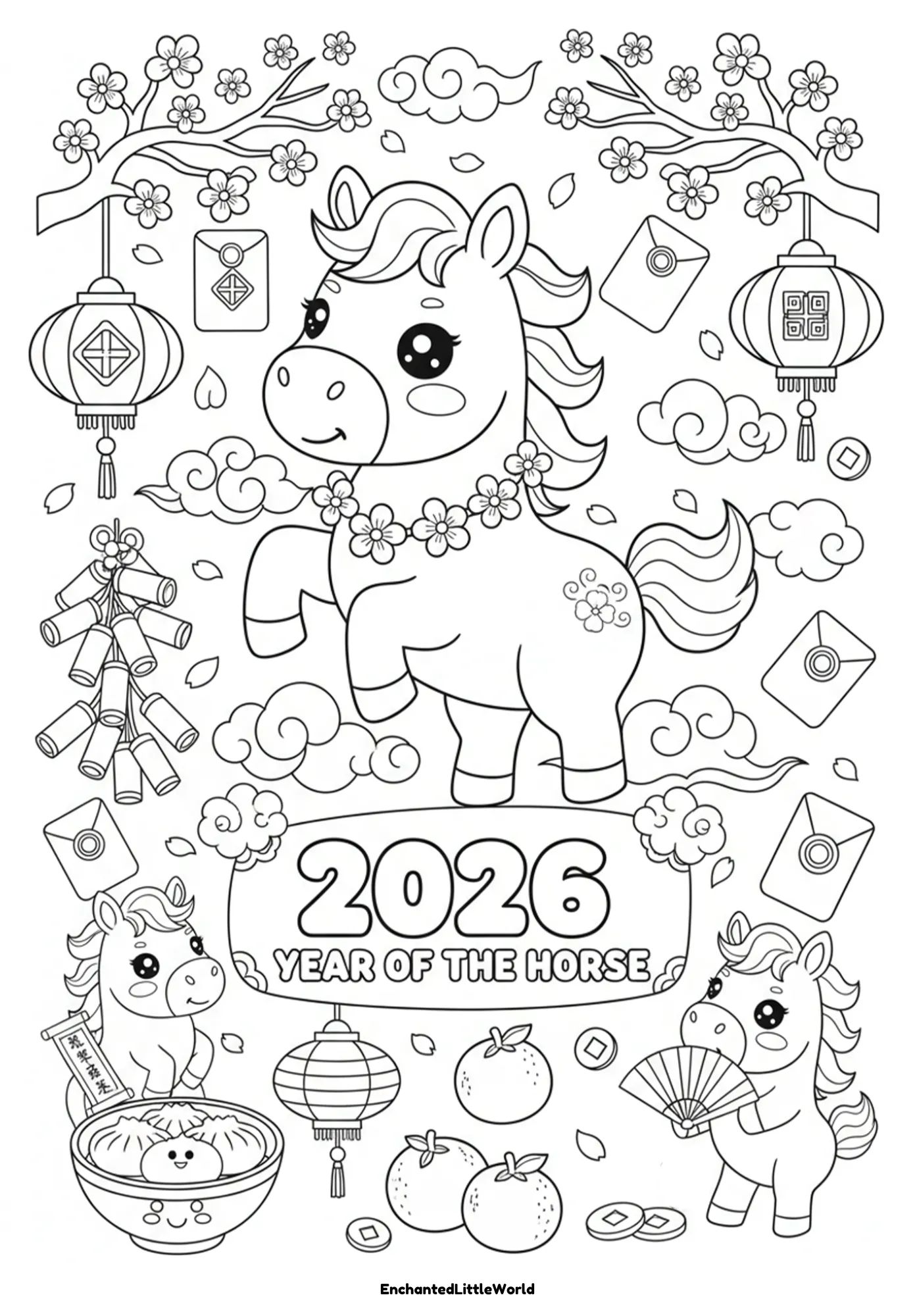 nside this 10-page collection, children will find majestic horses, festive lanterns, lucky gold coins, and traditional holiday symbols. Many pages feature the classic phrase 新年快乐 (Happy New Year) alongside the 2026 date, giving children a wonderful opportunity to connect art with cultural learning.
