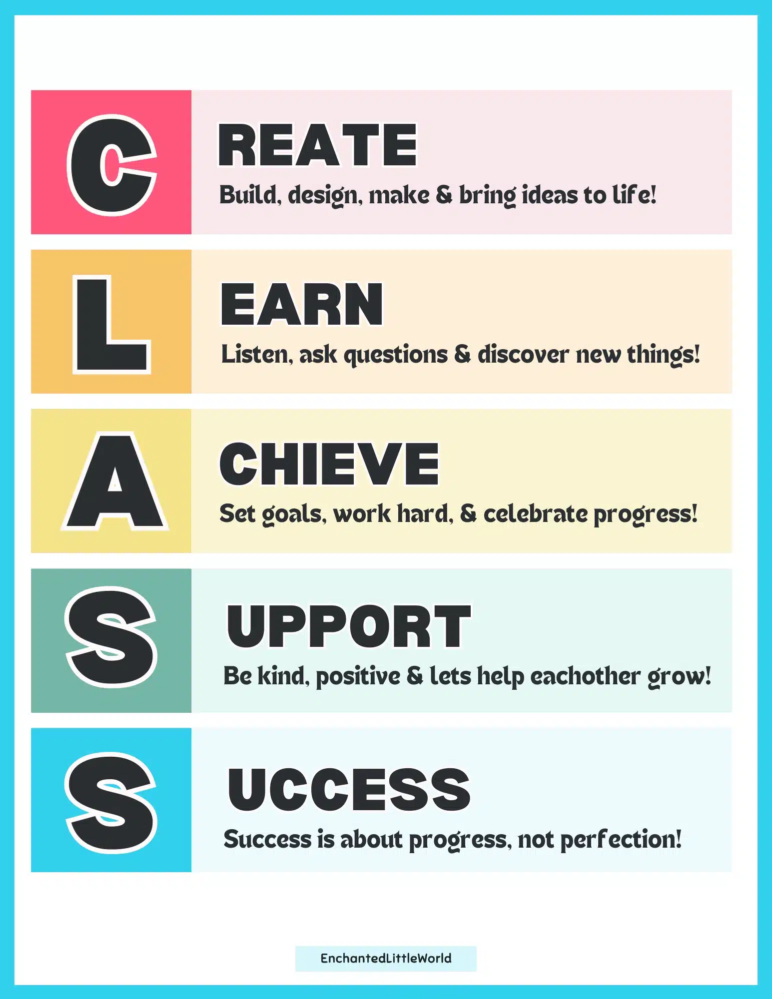 It makes a great visual reminder to kids to remember to create, learn, aspire, support, and celebrate success together. 🌟