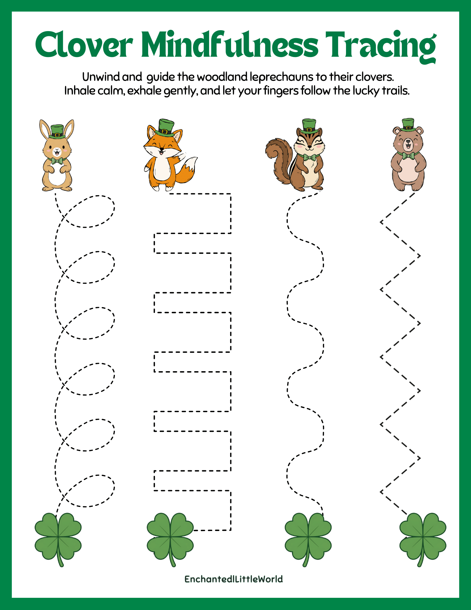 📥 Trace and Breathe — Encourage kids to inhale calm and exhale gently as their fingers follow the lucky trails.