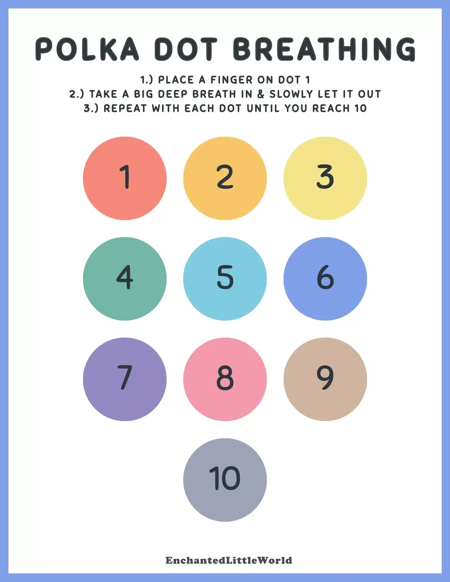Kids place their finger on the first dot, take a deep breath in, and slowly exhale as they move to the next dot.