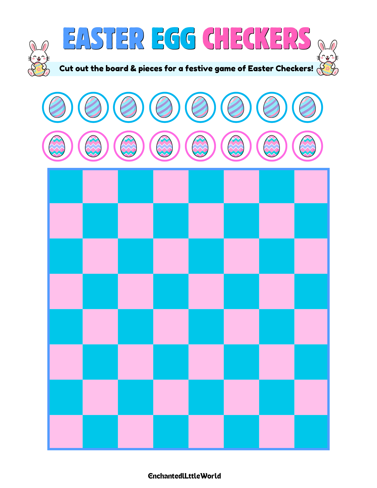 Bring a touch of strategy and festive fun to your morning with this free printable Easter checkers game for kids, with al Easter Checkers game board & pieces.