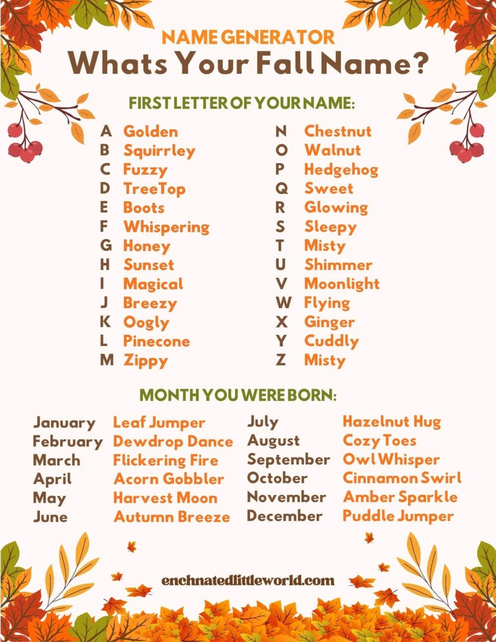 Discover your cozy, Autumn-inspired name with our free printable Fall name Generator!