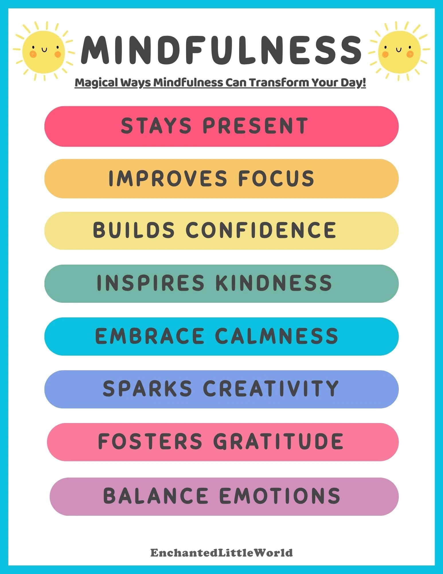 This colorful Magic of Mindfulness poster guides little ones through 8 wonderful ways mindfulness can transform their day! 🌟