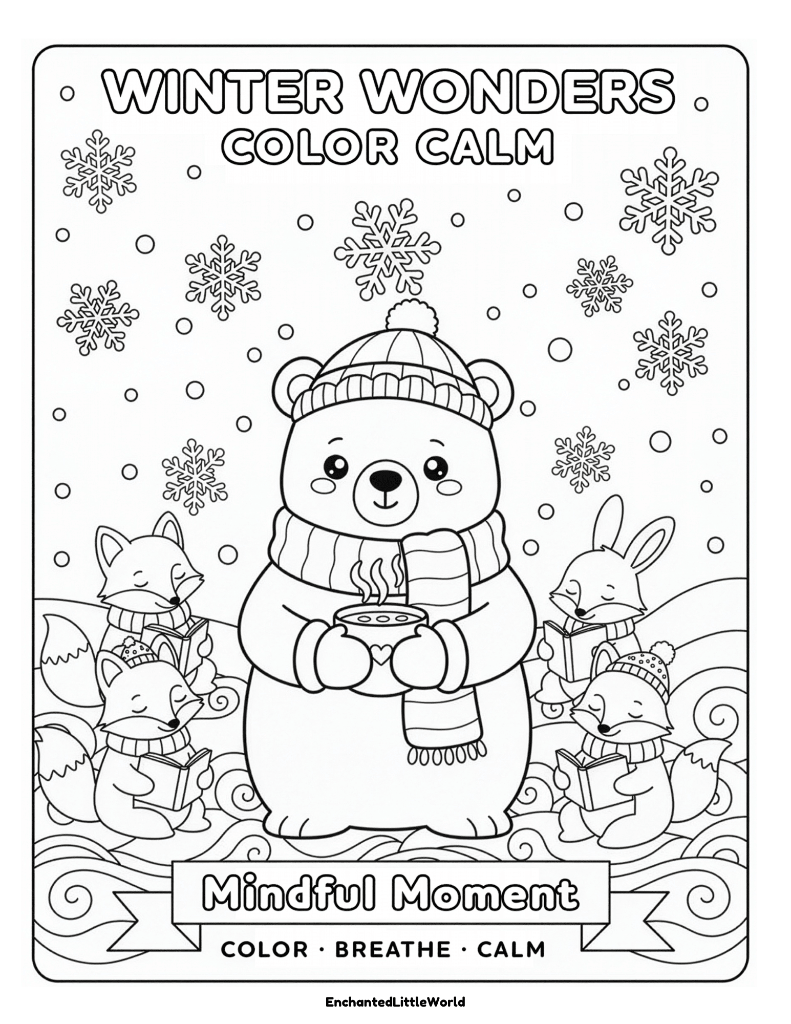 The Winter Wonders ยท Color Calm series focuses on intentional, uncluttered designs that give kids the mental space to relax. The gentle lines of our reading bear scene encourage artistic expression while keeping the overall experience soothing, quiet, and unhurried. ๐๏ธ