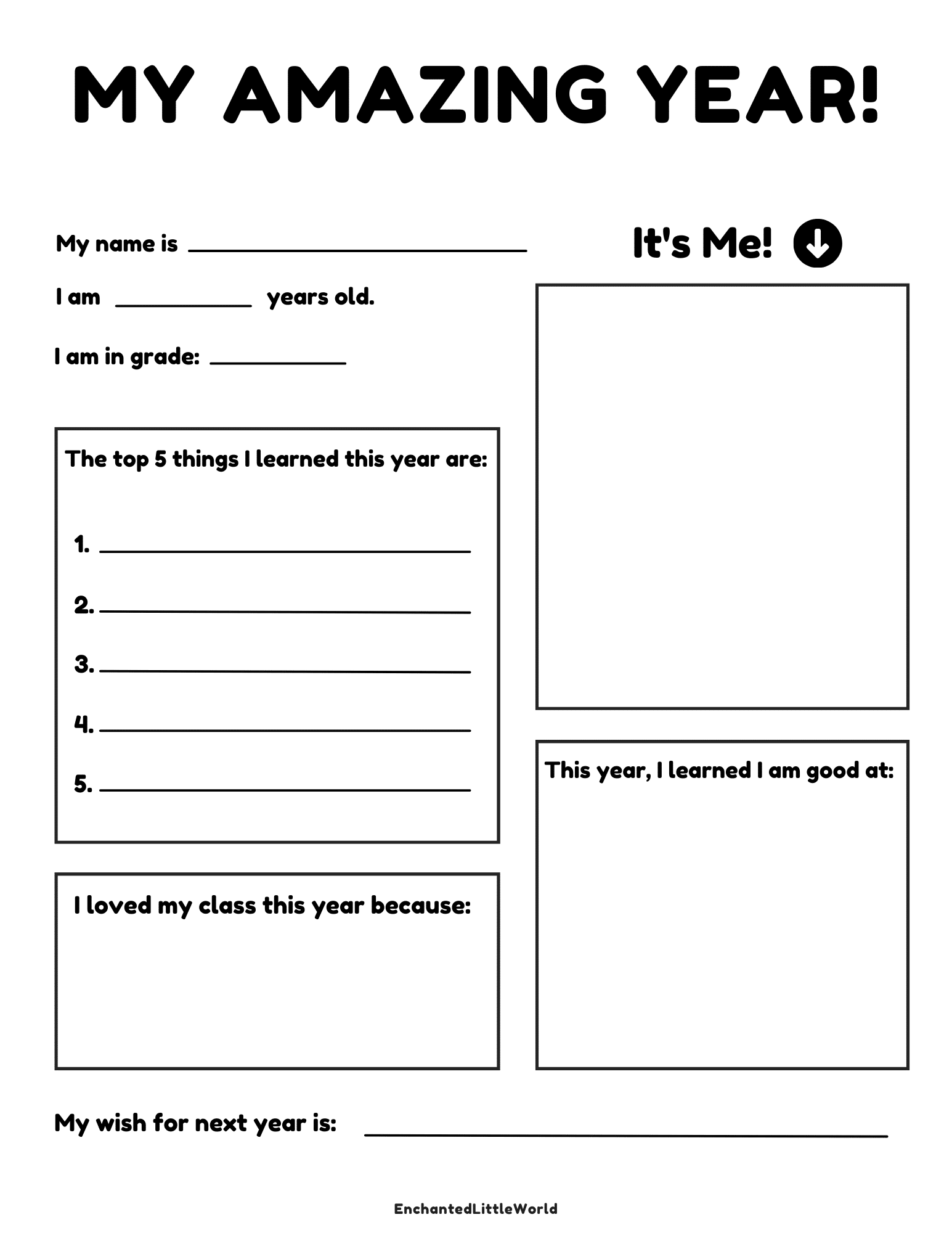 This year in review worksheet for kids encourages children to remember moments that made them smile, things they learned, and challenges they worked through 📘. By focusing on accomplishments and progress rather than mistakes, the activity helps children recognize how much they’ve grown over the year 🌱. It’s a wonderful way to reinforce self-awareness and pride in effort.