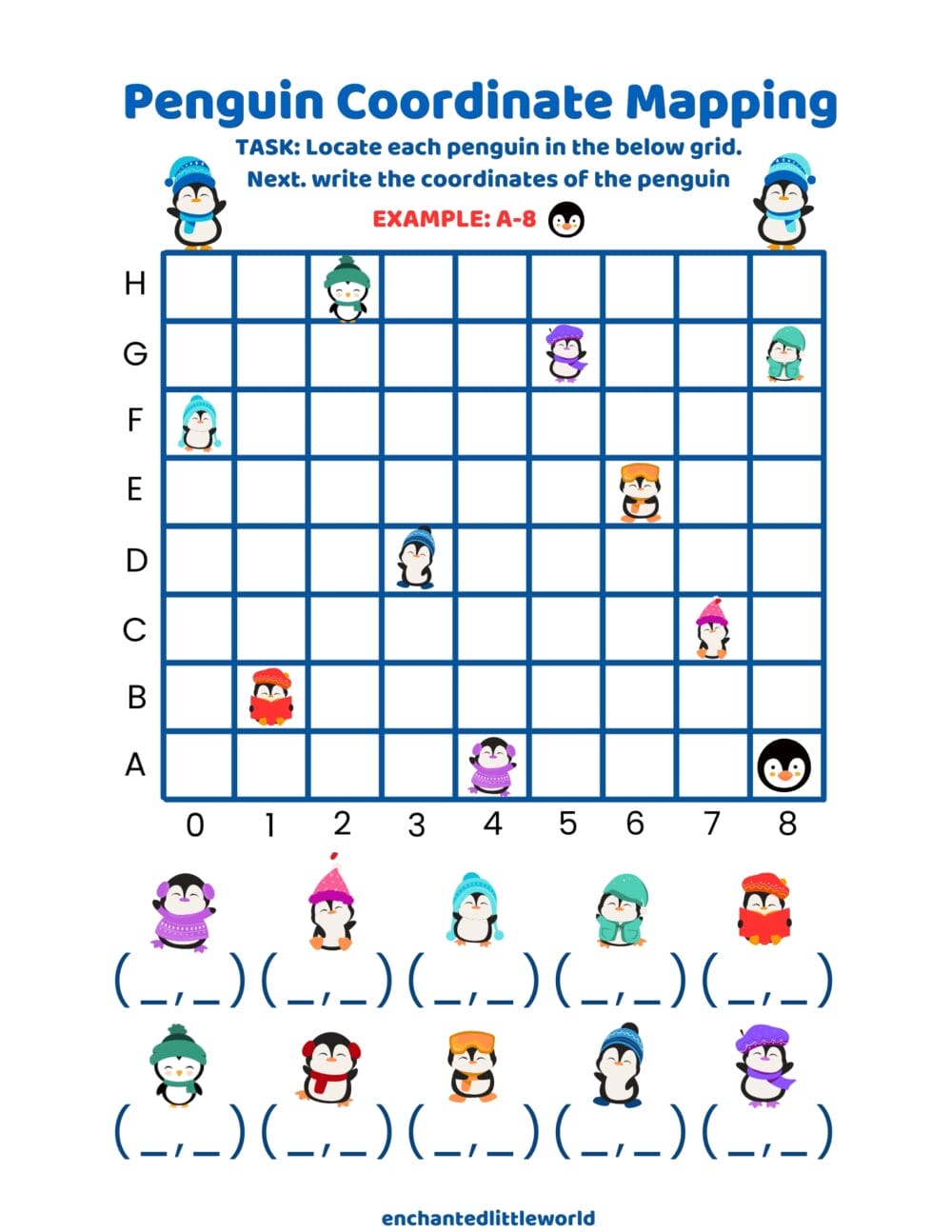 Our Free Printable Penguin Coordinate Mapping Worksheet combines learning and fun as kids locate adorable penguins on a grid & record their coordinates.🐧