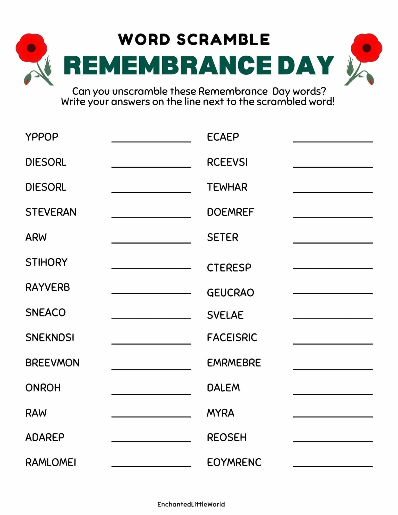 This Free Printable Poppy Day Word Scramble is a fun and educational way for kids to learn new vocabulary while reflecting on peace, bravery, and gratitude. 🌹