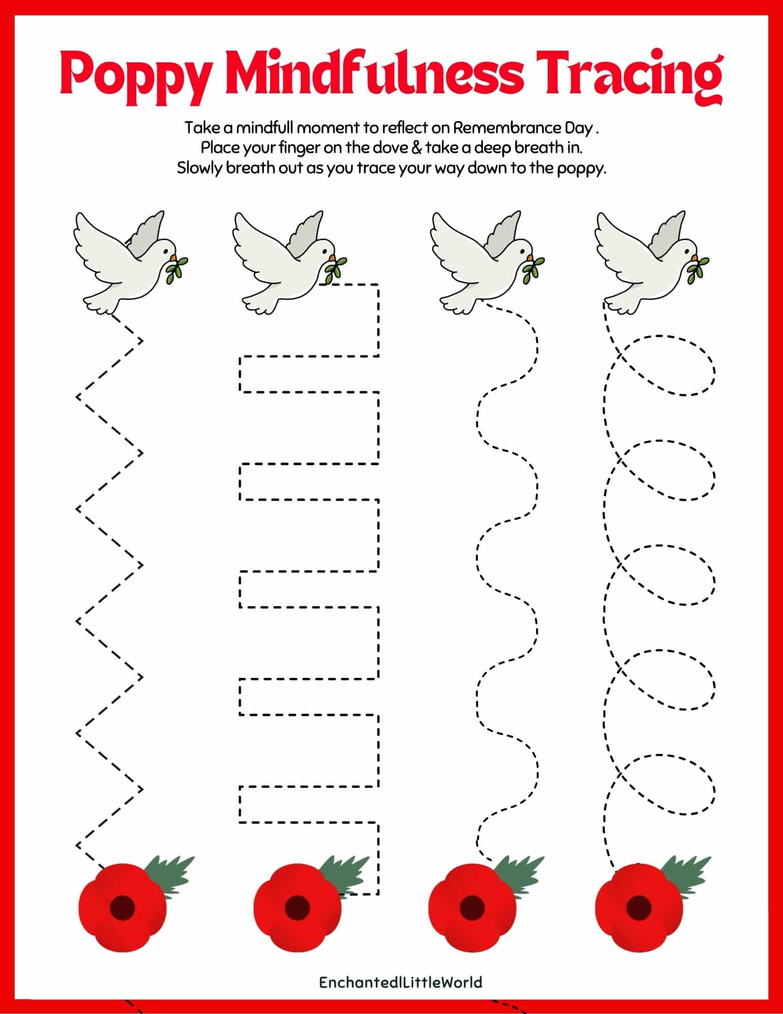 This calming Remembrance Day mindfulness printable helps kids pause, breathe, and reflect while tracing peaceful patterns inspired by doves and poppies. 🕊️