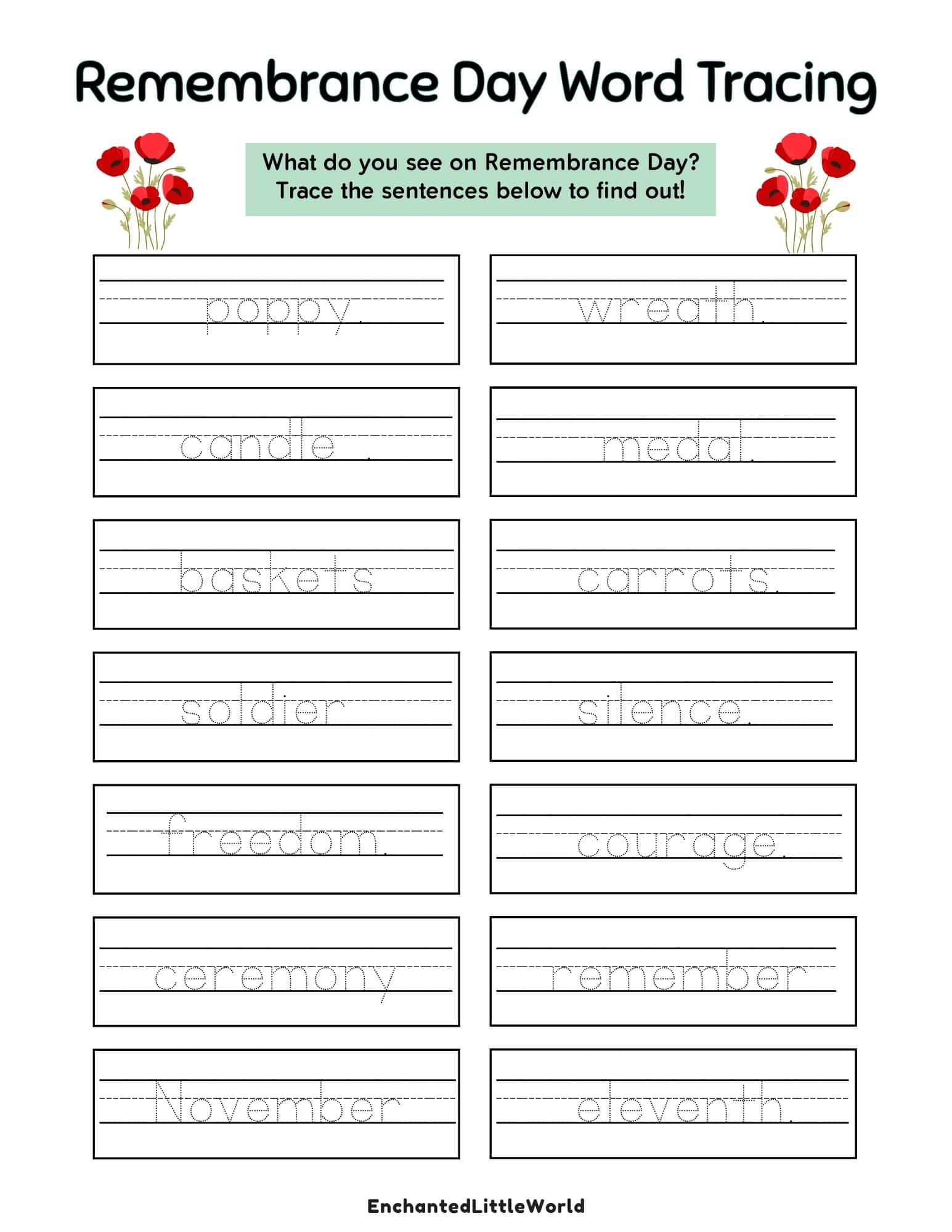 Help children build handwriting skills while learning the meaning of Remembrance Day with this gentle, educational Remembrance Day Word Tracing Worksheet. 🌹
