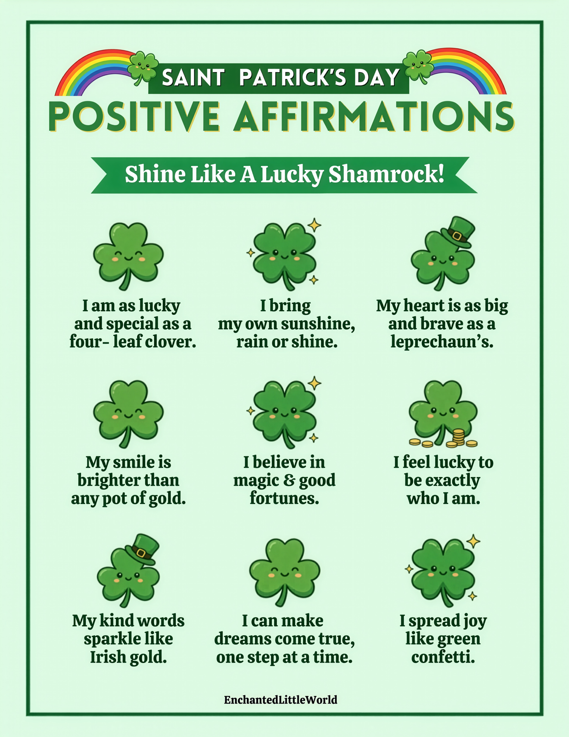 🎩 Morning Magic Find — Place the affirmations poster on a child’s desk or breakfast plate as a surprise “visit” from a leprechaun.