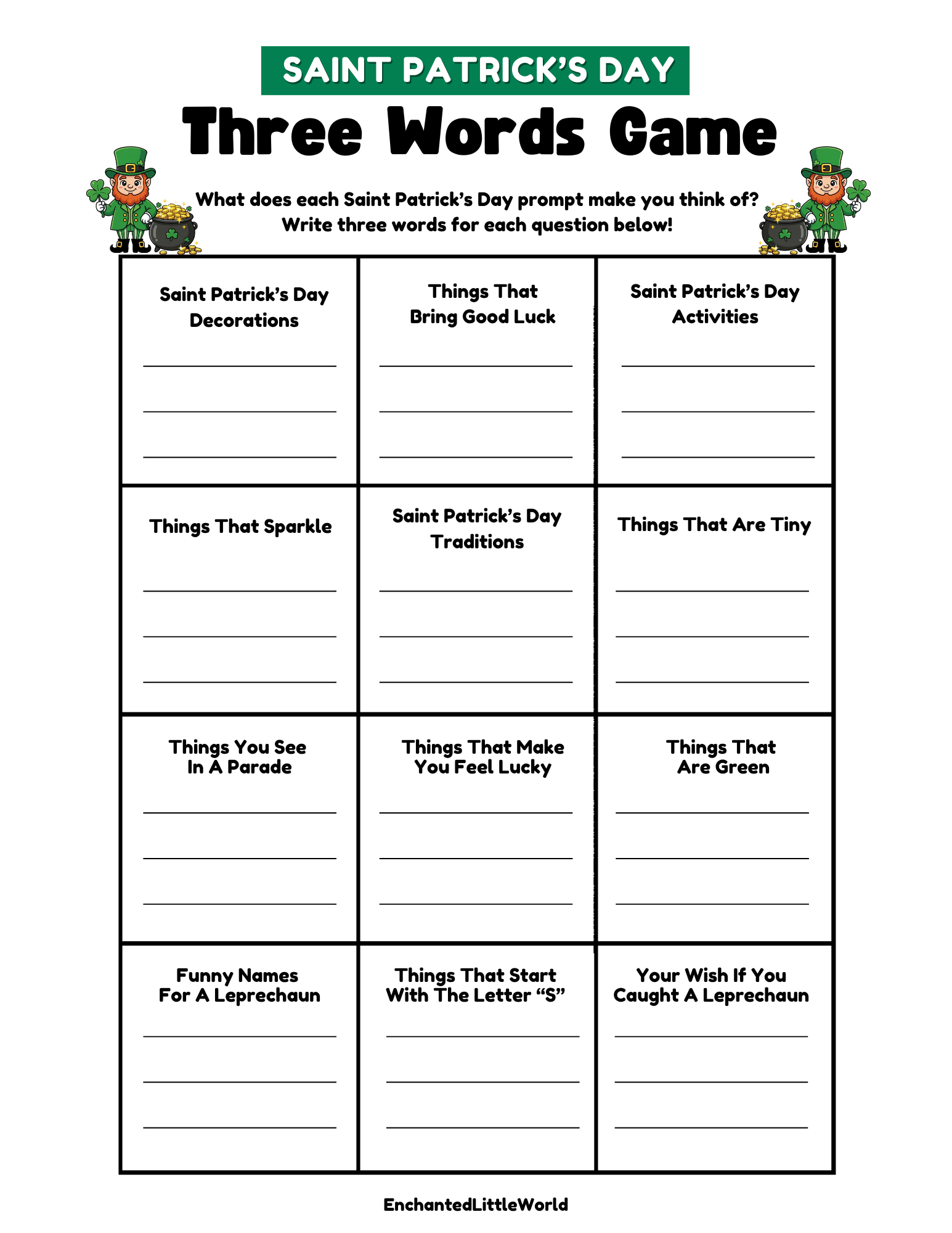 This free Saint Patrick’s Day PDF is ready to go with no prep required: Download your free printable saint patricks day three words game today and start spreading festive smiles! This high-quality Saint Patrick’s Day creative resource is available for instant download with no sign-up required. 😄
