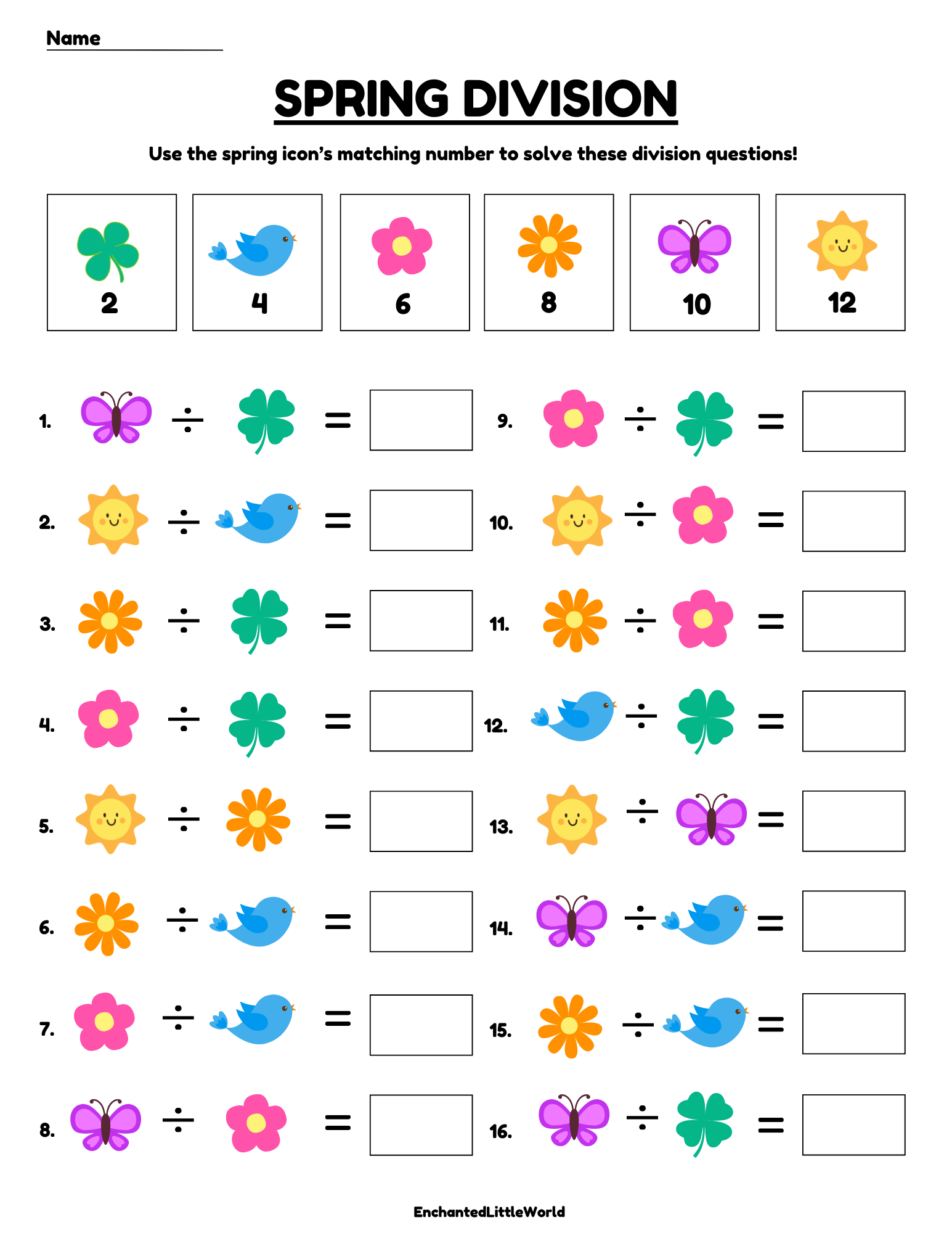 Spring is blooming—and so are learning opportunities! Kids get to solve division equations using cute icons like butterflies, flowers, sunshine, and more 🌸