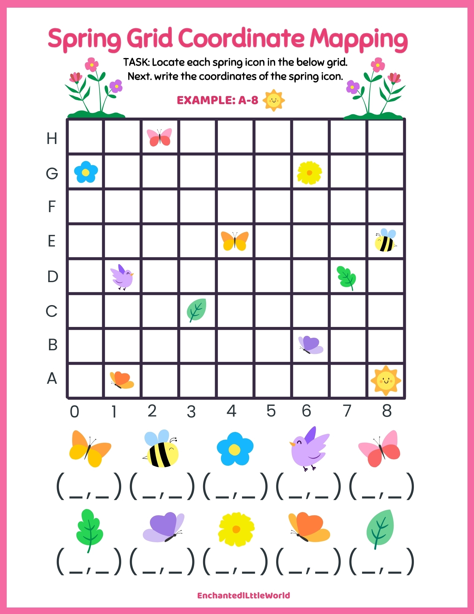 Kids will locate Spring-themed objects on the grid and record their coordinates—just like real explorers!