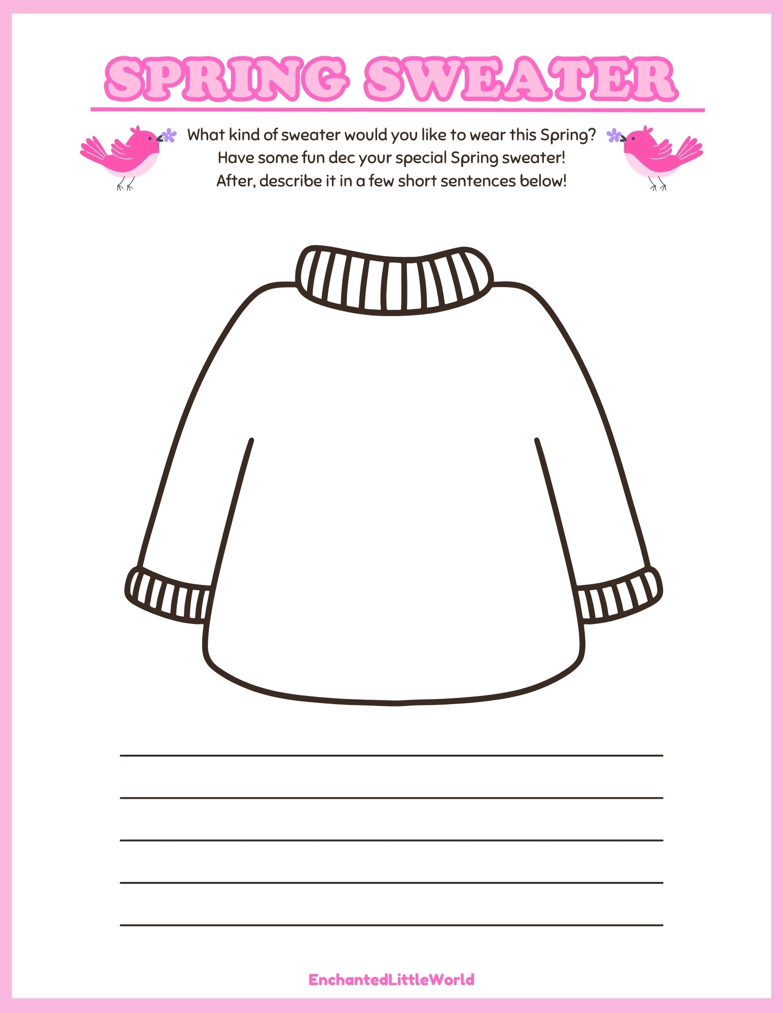 🌸 Design & Decorate: Kids can color and customize their sweater with flowers, butterflies, rainbows, or anything that reminds them of Spring!