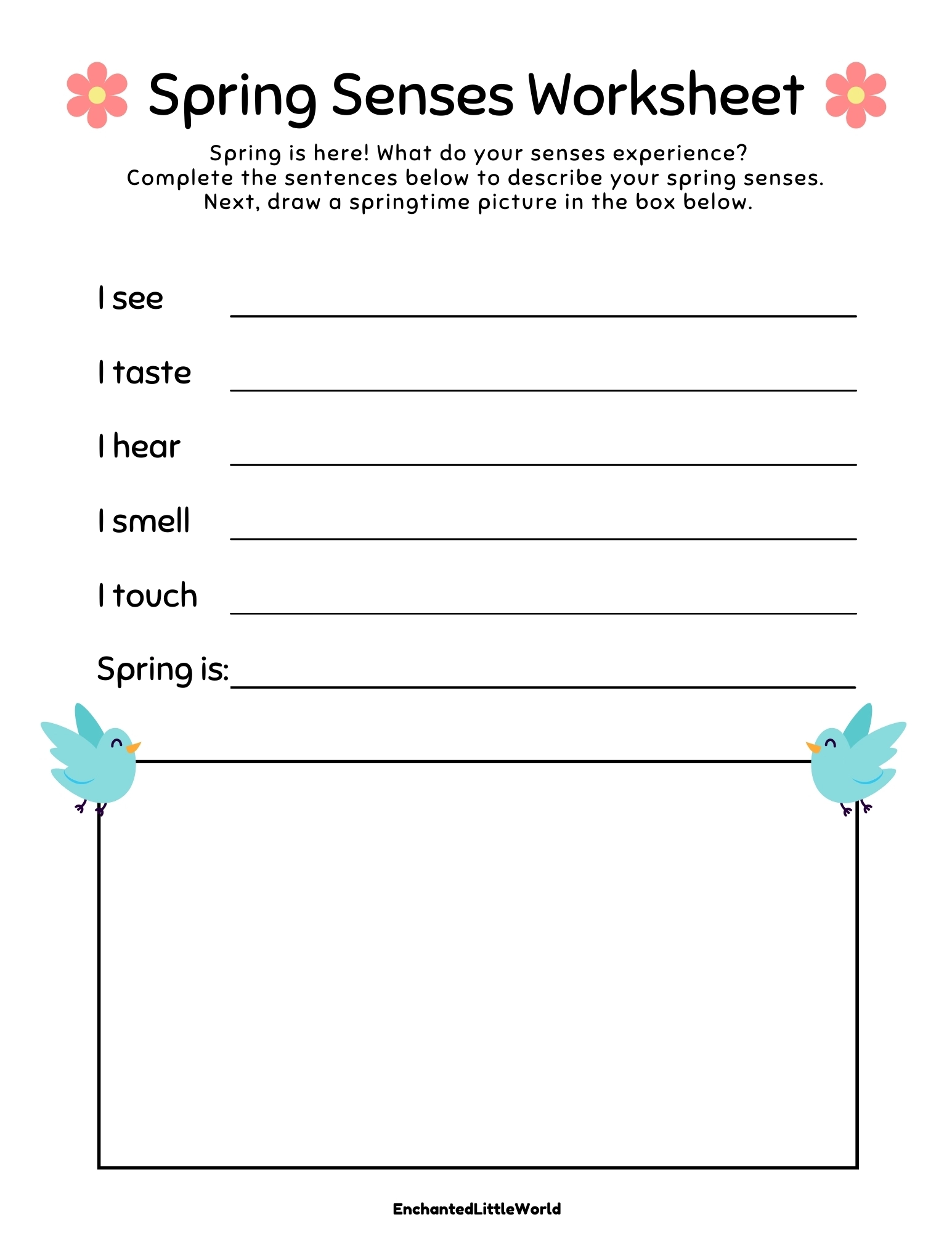 Kids will complete sentences like “I see,” “I taste,” “I hear,” and “I smell,” and then they can draw a springtime picture in the box below!
