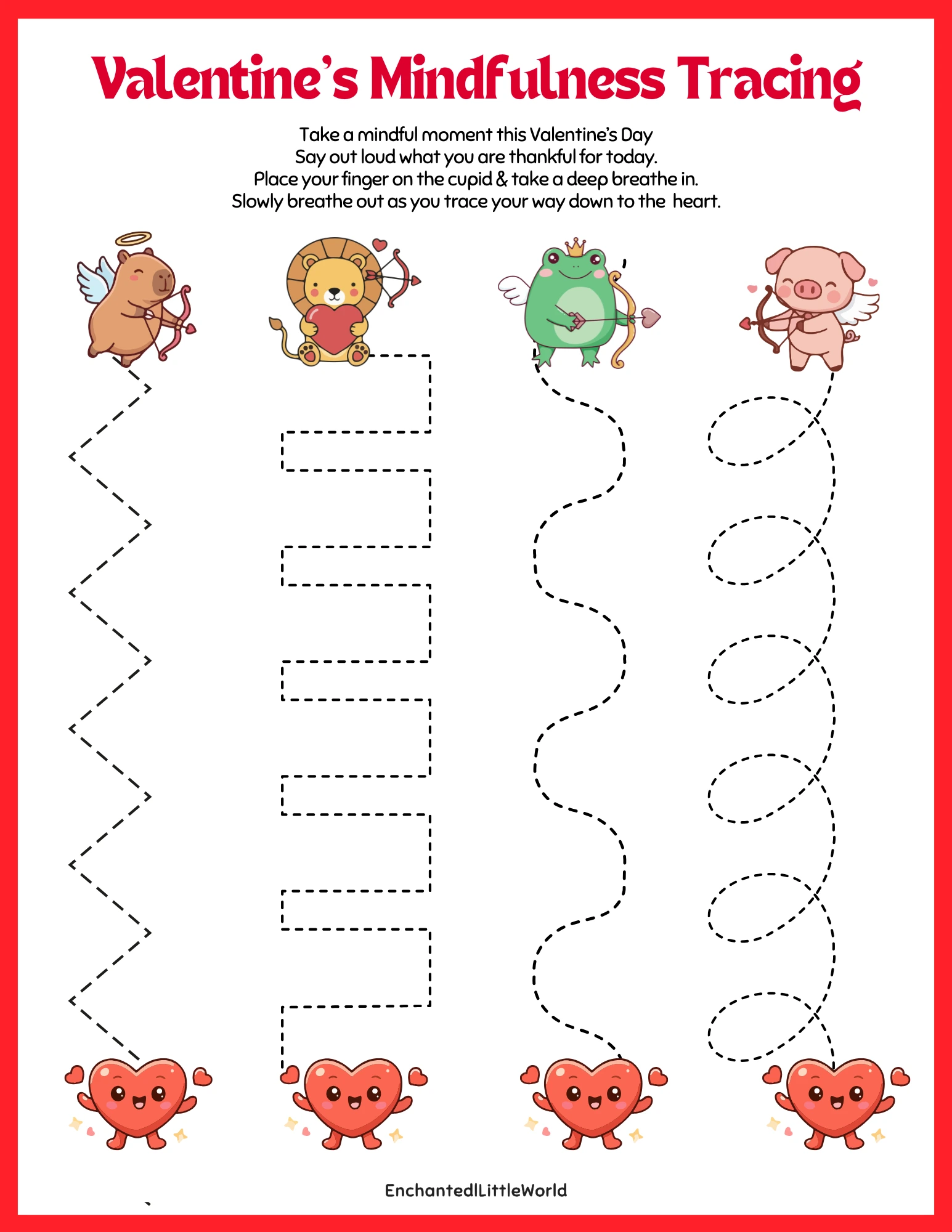 This free printable Valentine’s mindfulness tracing activity for kids helps children practice calm breathing, gratitude, and focus through guided tracing paths and simple SEL prompts. 💖