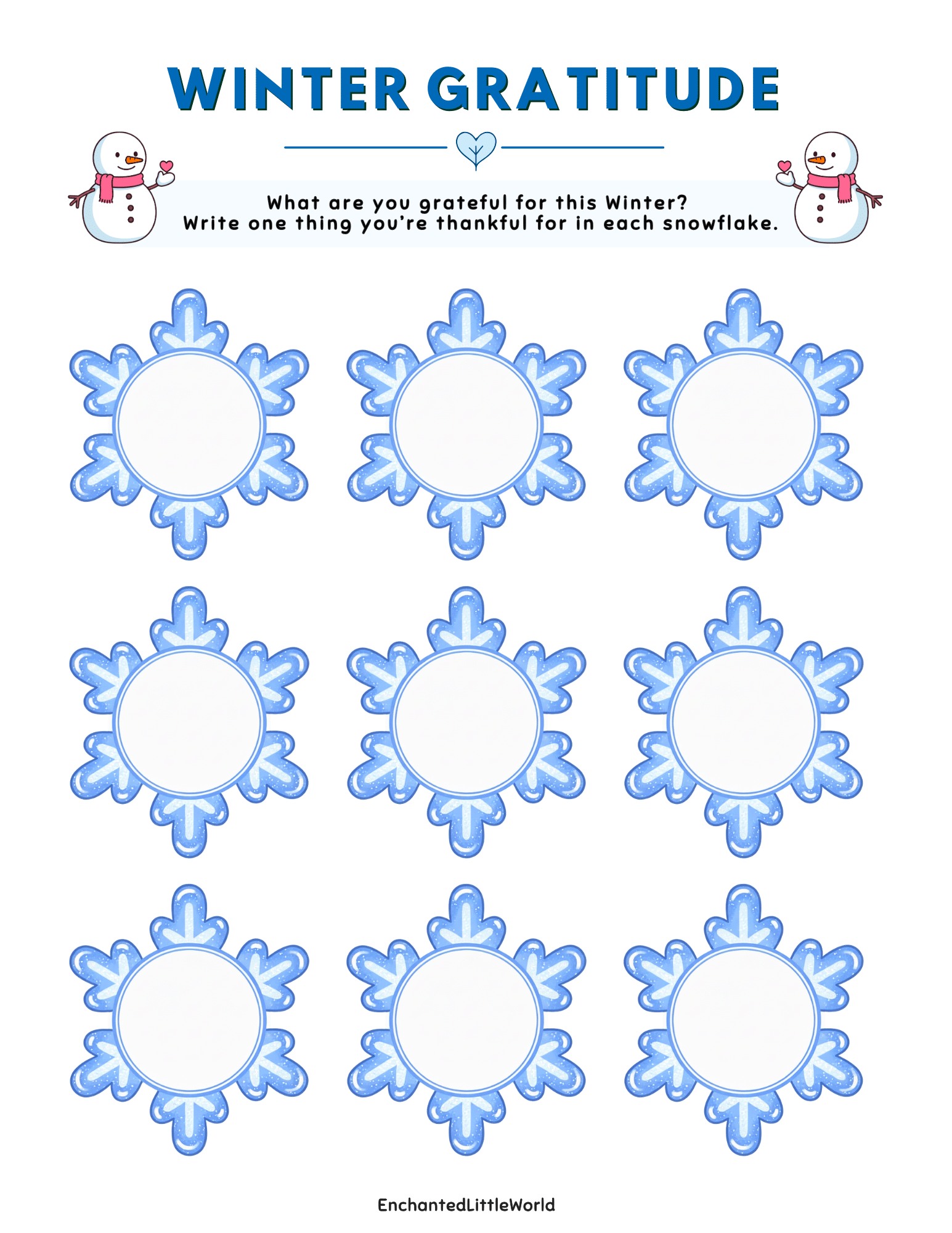 The activity asks children to write one thing they are thankful for inside each of the nine decorative snowflakes provided on the page. It serves as a simple yet powerful social-emotional learning worksheet that helps kids slow down and appreciate the small, cozy moments that make winter special. ❄️