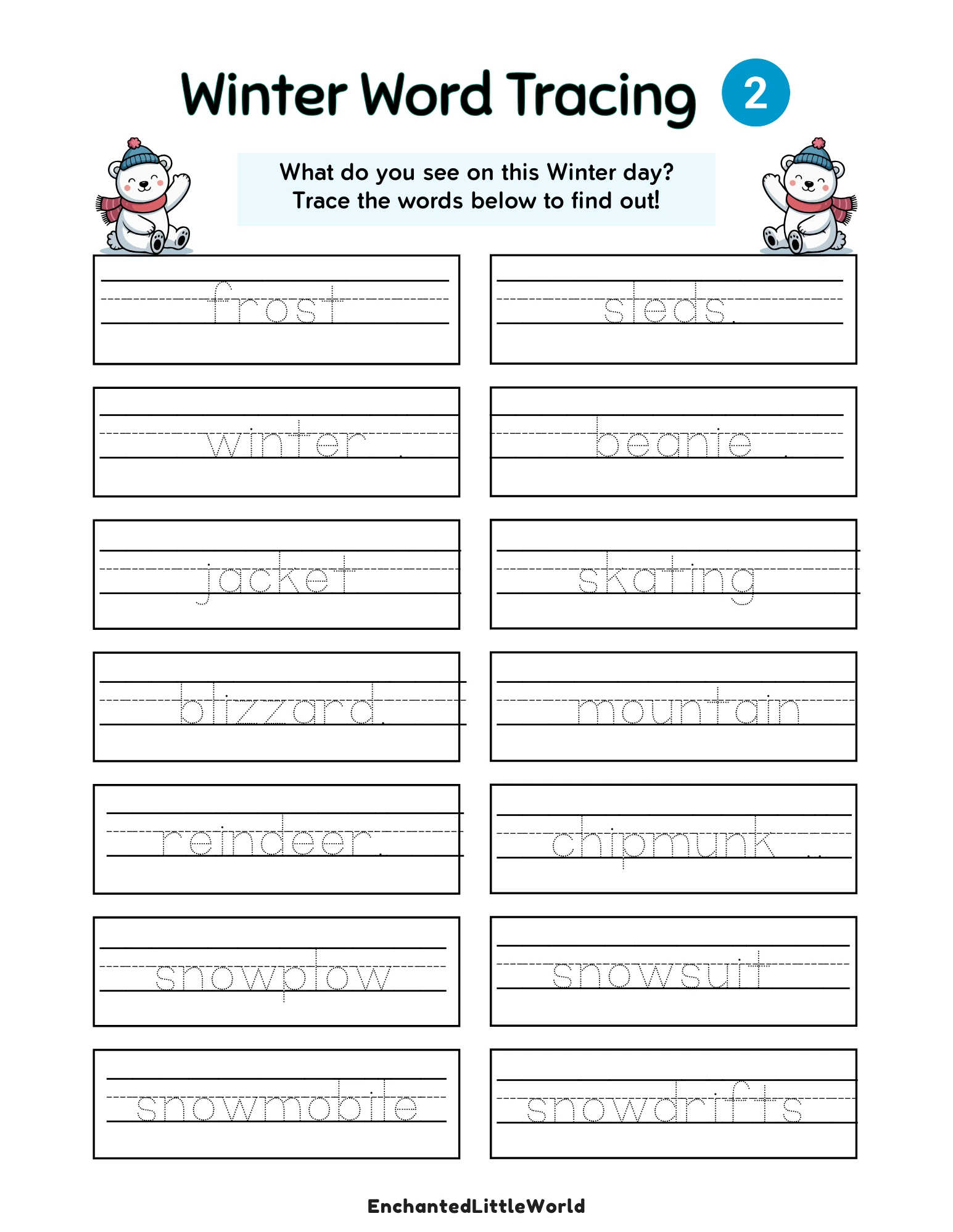Children will trace fourteen different words, helping them build confidence with handwriting while strengthening hand control and pencil grip. The winter theme keeps kids interested, especially during colder months when indoor activities are needed most. ❄️