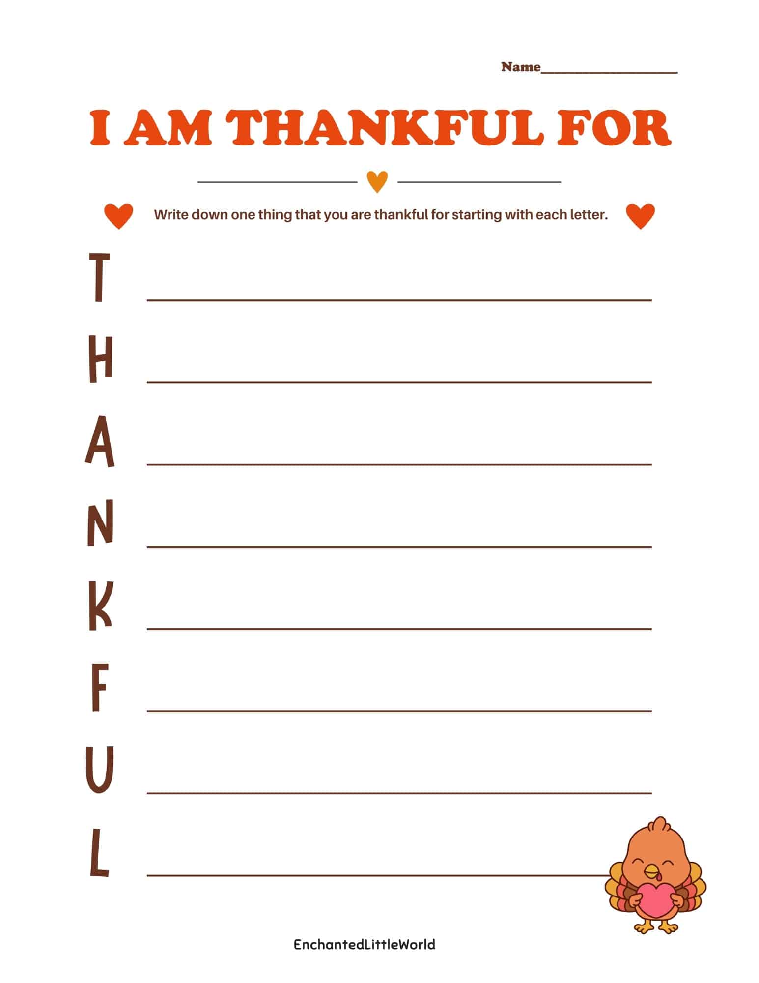 Designed with simple, kid-friendly lines and a cheerful turkey theme, this Thanksgiving thankful worksheet encourages children to slow down, think deeply, and write one special thing they appreciate for each letter of the word THANKFUL. 🍁