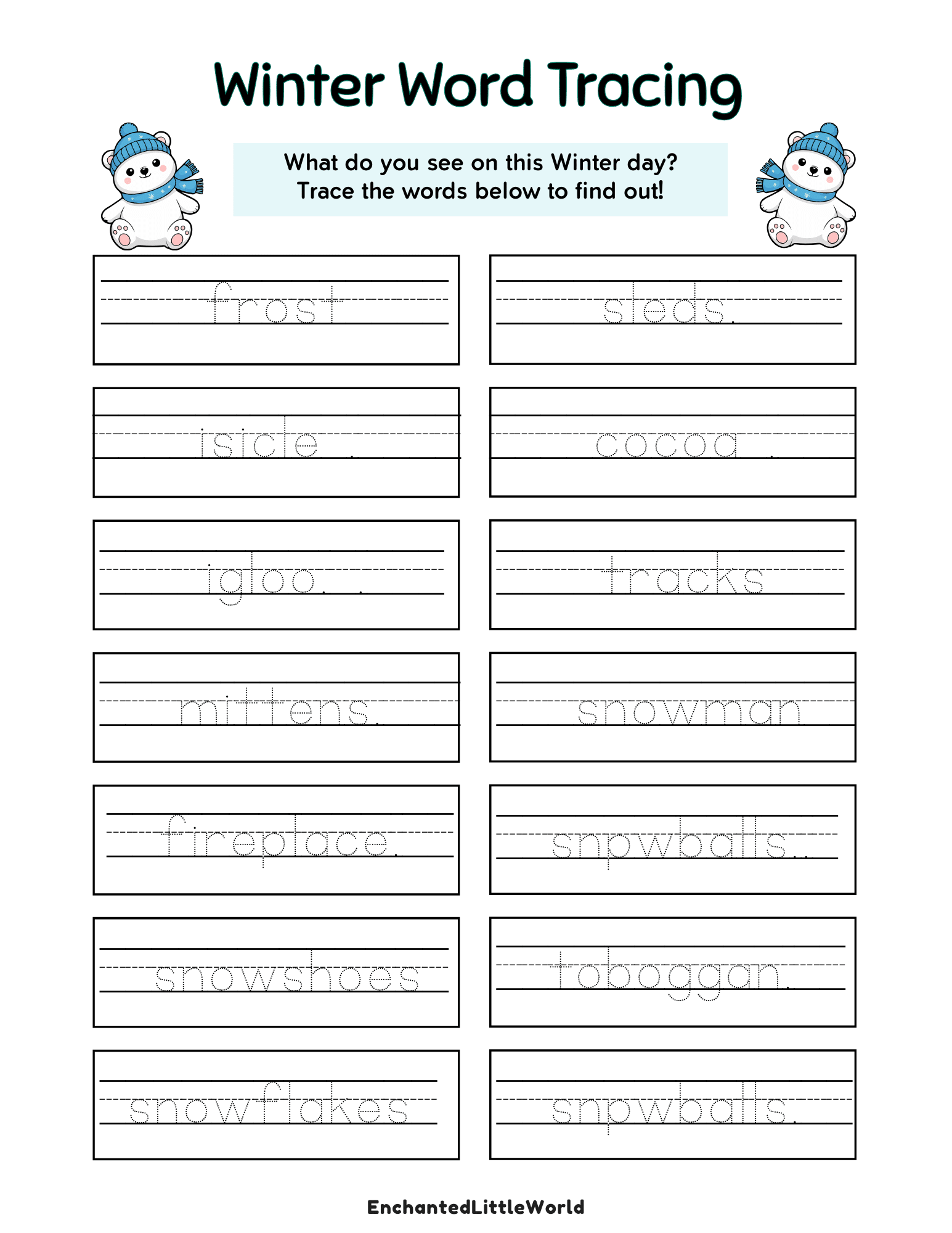 As an early literacy winter printable, it encourages children to identify and trace common words they might encounter during the colder months. By practicing these winter words for tracing, kids improve their letter formation while expanding their vocabulary