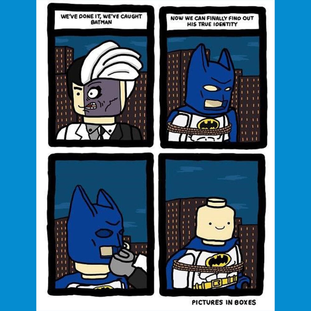 A four panel comic. The first showing a Lego figurine of super vilain two face. The 2nd Lego figuring Batman tied up. The 3rd shows Two Face's Lego hands removing Batman's mask. The 4th shows a very plain looking classic smiling Lego head.