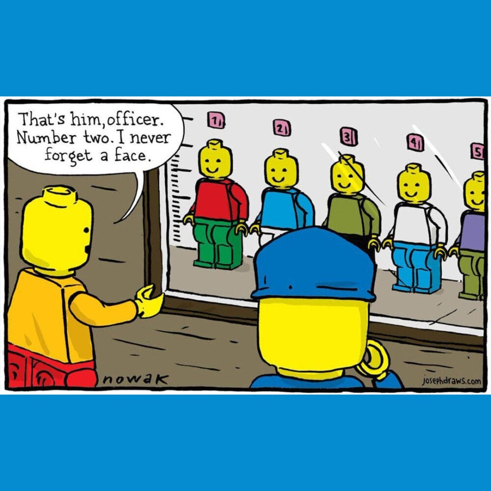 A lego figurine in a police station pointing at a lego figurine in a police line up.