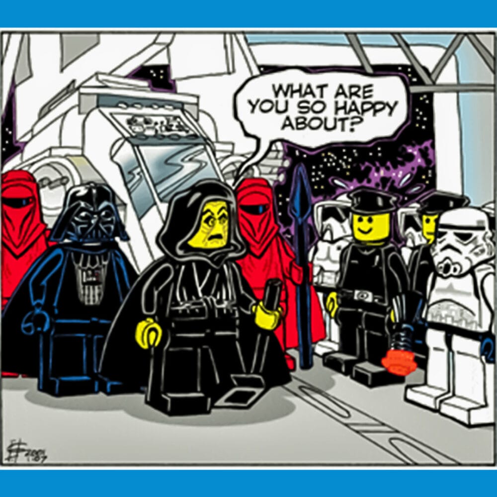 Lego Star wars scene with Darth Vader & Darth Maul walking by Lego Stormtroopers and one happy guard.