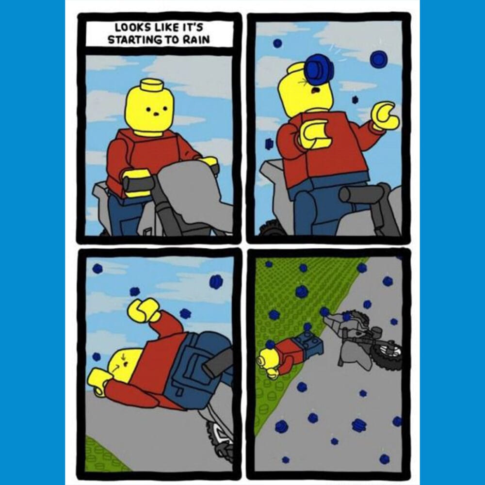 A four panel comic. The first a Lego man climbing a cliff. The 2nd a Lego rock appearing to hit him in the face. The 3rd, he is laying down. The fourth is an aerial shot that shows many Lego Rocks raining down.