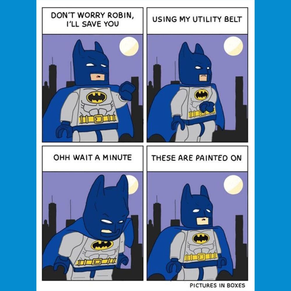 A four panel comic showing Batman on the roof staring at the city staring out. He reaches for his utility belt only to realize it is only painted on.