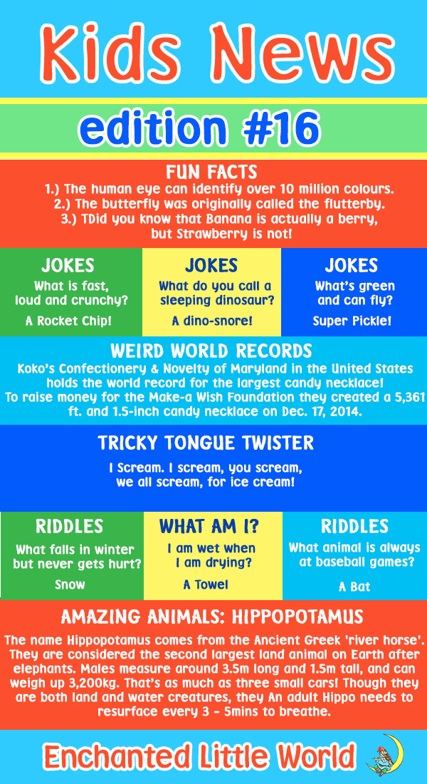 Kids News is a happy and colourful weekly newsletter packed full of cool content. Riddles, jokes, weird world records, fun facts, amazing animals and good old-fashioned tongue twister!