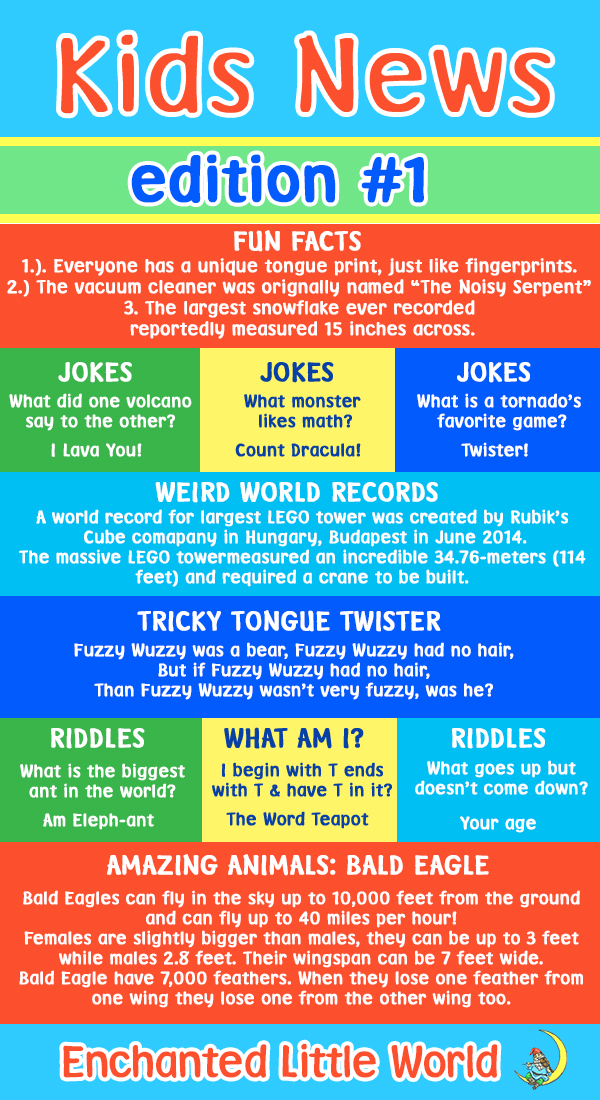 Kids News delivers interesting content in the form of riddles, jokes, strange world records, fun facts, amazing animals, and good old-fashioned tongue twisters.