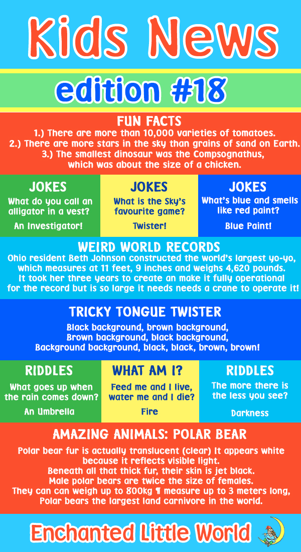 Kids News delivers interesting content in the form of riddles, jokes, strange world records, fun facts, amazing animals, and good old-fashioned tongue twisters.